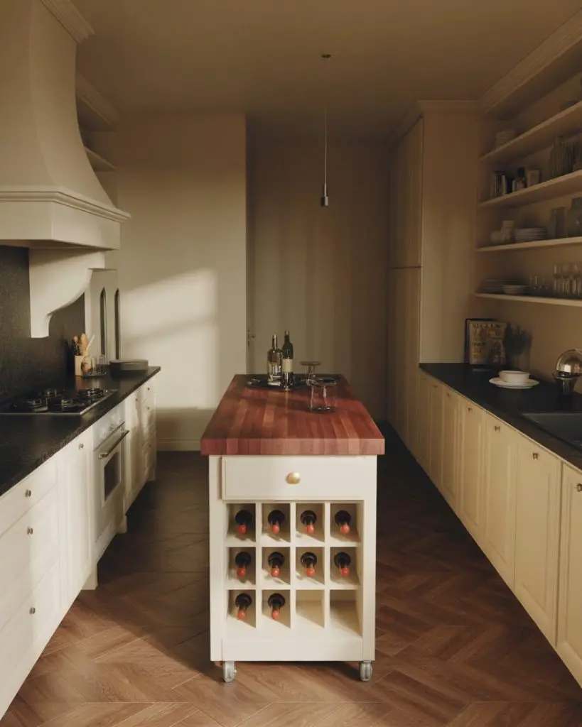 Practical insight: Wheeled islands should be substantial enough to stay stable during use but light enough to move easily—look for pieces in the 100–150 pound range with locking casters. Add a thick cutting board or marble pastry slab on top to increase work surface without permanent weight.