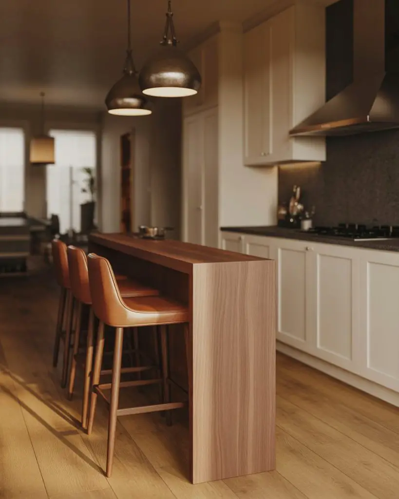 A breakfast bar extending from one galley wall transforms dead space into casual dining without requiring a full peninsula or island. This renovation strategy works when you have even 12–18 inches of extra width on one side—enough for a narrow counter extension and wall-mounted stools. It’s particularly smart in apartments where every function needs to overlap efficiently.