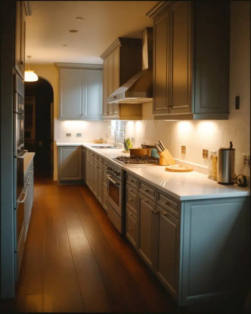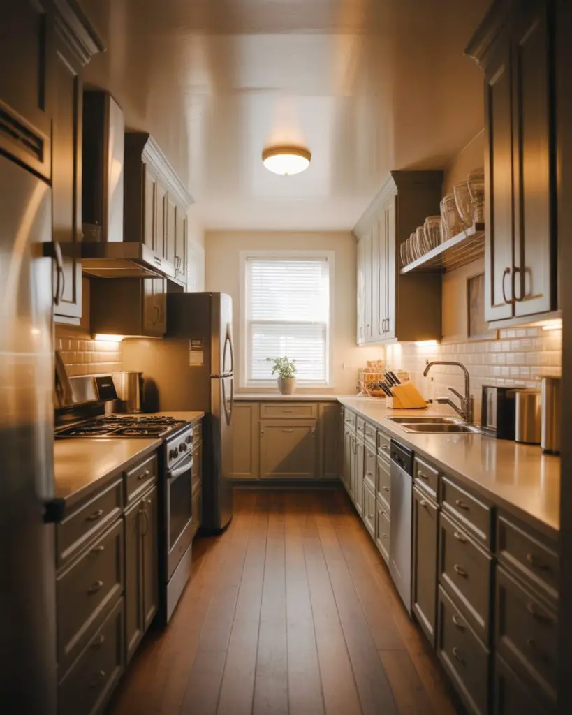 Common mistake: Over-accessorizing narrow galleys with bulky rugs, oversized light fixtures, or too many open shelves creates visual chaos. Instead, keep surfaces clear, choose one statement light fixture, and use a simple runner that doesn’t overwhelm the proportions of your space.