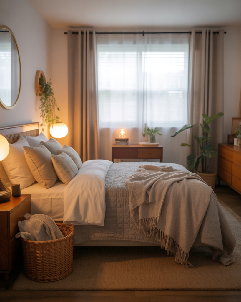 Real homeowner behavior shows that guests often mention lighting as make-or-break for comfort—too bright feels institutional, too dim feels dreary. Install bedside lamps with three-way bulbs or dimmers so guests control their own lighting preferences. Add a comfortable chair if space permits; guests appreciate somewhere to sit besides the bed for putting on shoes, checking phones, or reading. Window treatments should offer both light control and privacy—top-down/bottom-up shades excel at this. Small touches like a water carafe, phone charging station, and extra blanket make the relaxing component feel intentional rather than accidental. The space should feel complete and considered without being fussy.