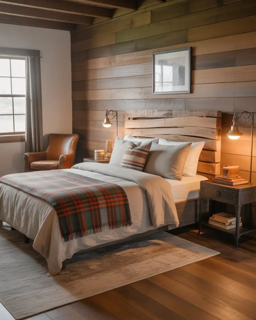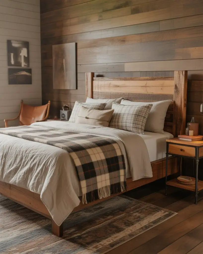 Where this works best: mountain homes, renovated barns, lakeside cottages, and suburban houses where homeowners want one room with distinct character. Modern rustic avoids the heavy, dark aesthetic of 1990s lodge design—instead, it incorporates weathered wood tones with plenty of white and cream to keep spaces feeling open. Add contemporary elements like sleek lighting or abstract art to prevent the room from reading as theme-park rustic. A stone fireplace (or even electric version) becomes a massive asset in rustic guest rooms, providing both visual interest and practical warmth during colder months.