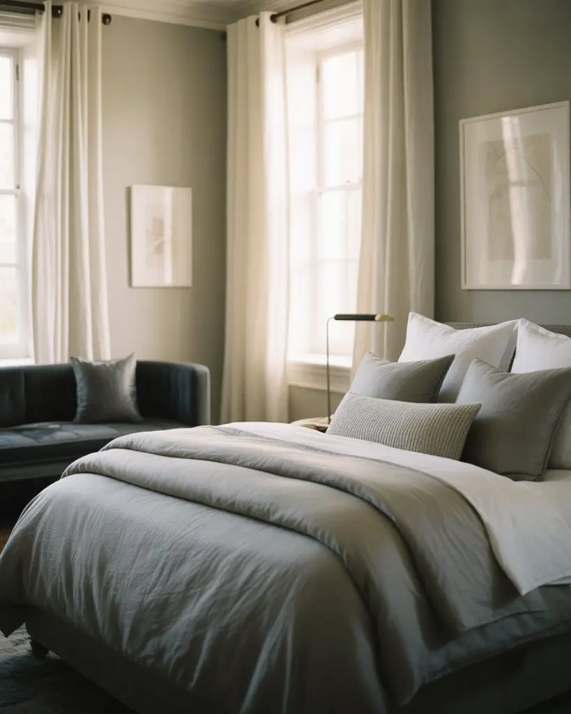 A grey color scheme offers sophisticated neutrality that works with virtually any accent color your guests might bring with them. From pale dove to deep charcoal, grey provides a backdrop that reads as modern and refined without committing to stark white. Layer different grey tones throughout the room—walls, bedding, furniture—to create depth and prevent flatness. The color particularly suits cozy modern aesthetics where you want visual calm with subtle sophistication.