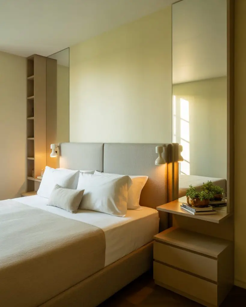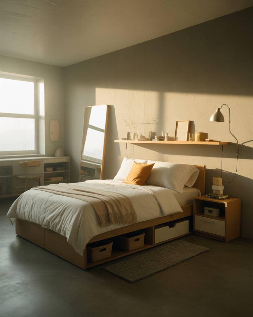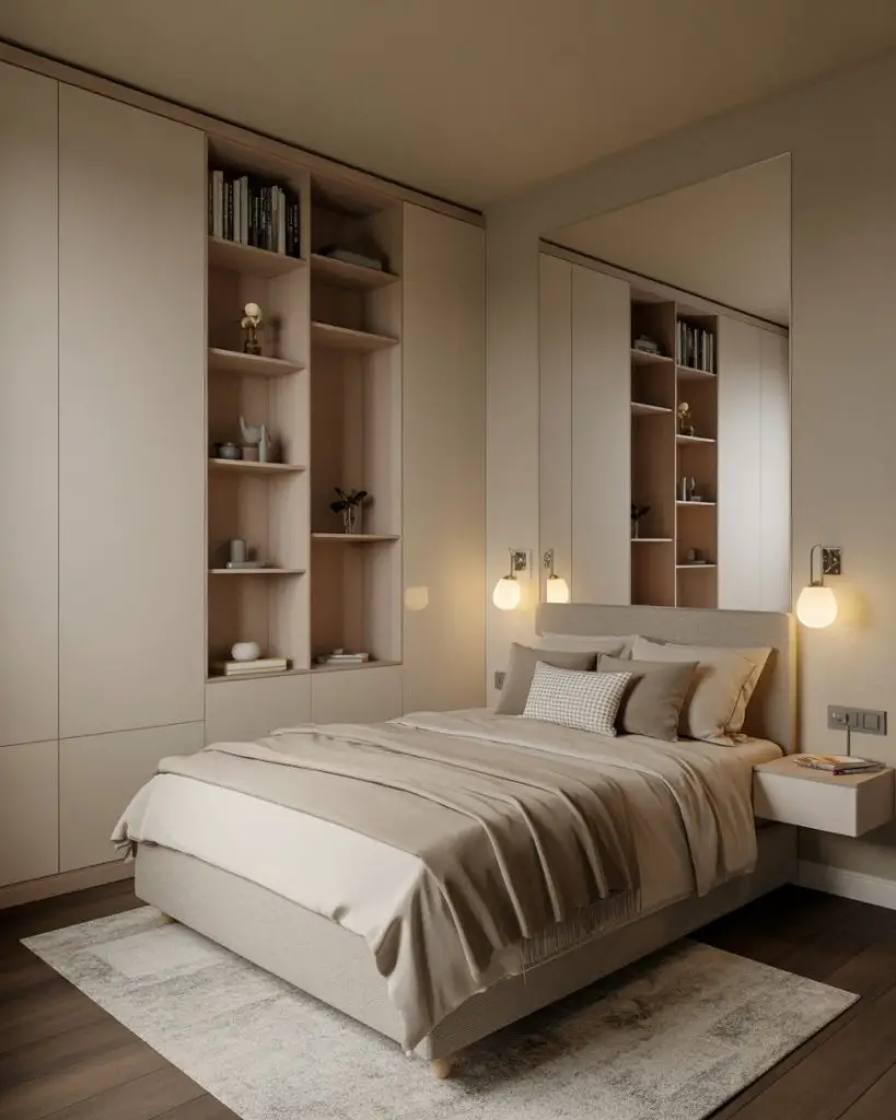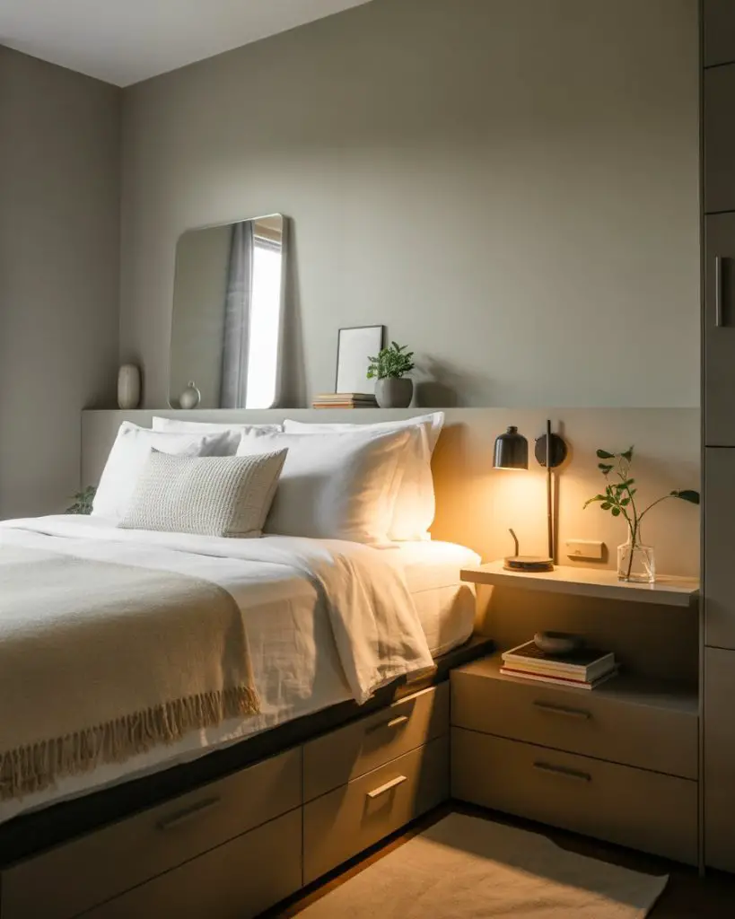 A tiny guest bedroom demands strategic choices that make the space feel intentional rather than cramped. Start with a wall-mounted nightstand that floats rather than sitting on the floor—this single change dramatically opens up visual space. Choose a bed frame with built-in storage underneath, and keep the color palette light to reflect available natural light. Even in tight quarters, you can create a cozy atmosphere through layered lighting: a small pendant or wall sconce instead of space-hogging table lamps.