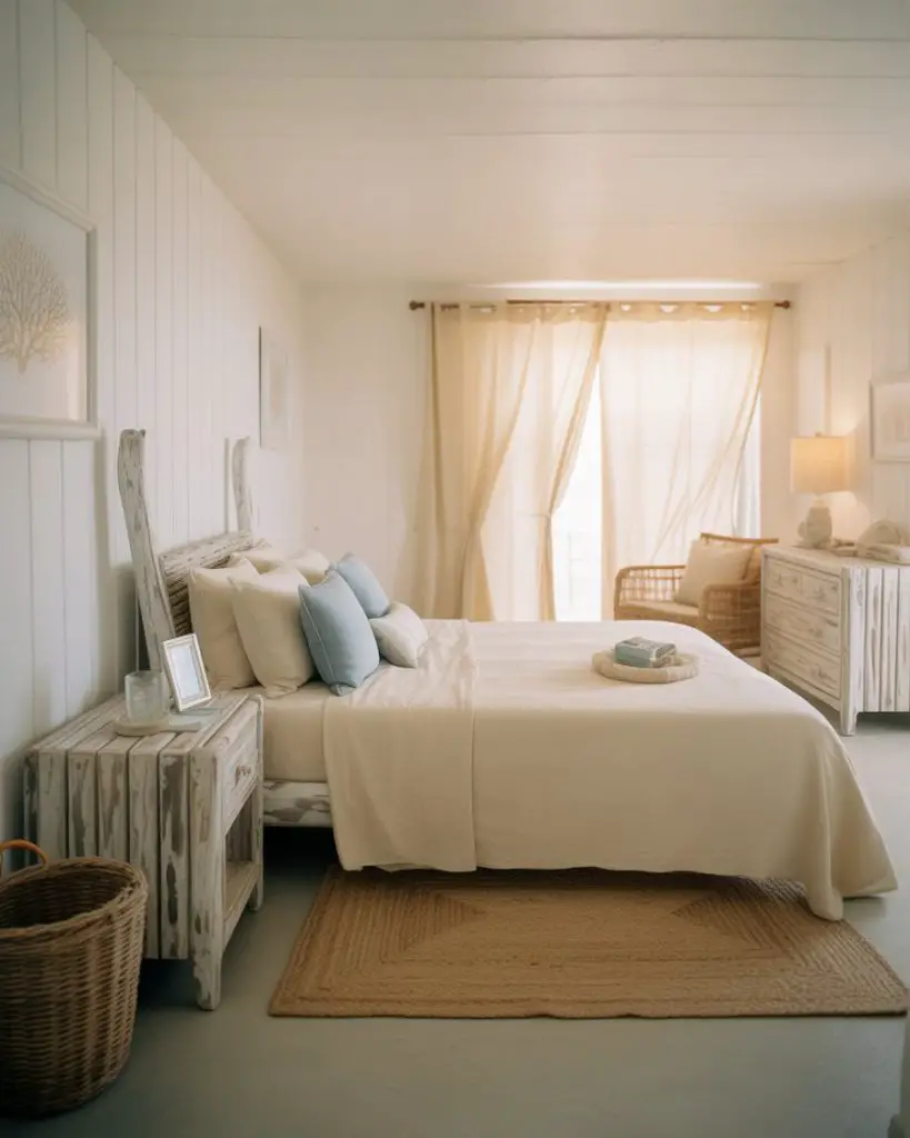 A coastal guest bedroom captures the relaxed elegance of seaside living through color, texture, and material choices. White or cream walls, natural fiber rugs, sheer curtains, and furniture with weathered wood finishes all reference beach house aesthetics. The style works nationwide—not just in actual coastal regions—because it taps into vacation mindset and universal associations with relaxation. Keep it subtle; you’re evoking a feeling rather than creating a literal nautical theme with anchors and sailboats.