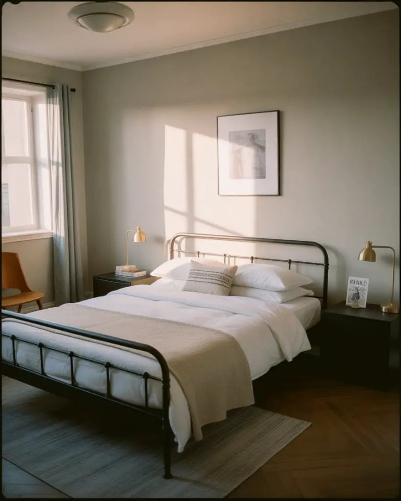 A common mistake is making black the only dark element in an otherwise light room—it can look jarring rather than intentional. Instead, repeat the black in smaller doses: picture frames, lamp base, hardware, or accessories. This creates visual rhythm and makes the bed frame feel like part of a cohesive design rather than an isolated statement. Black frames particularly suit modern and industrial aesthetics but work across styles when properly integrated. Budget tip: black bed frames often cost less than wood equivalents while looking equally sophisticated. Keep surrounding elements relatively simple; the frame provides enough visual interest that you don’t need additional drama from pattern or color.
