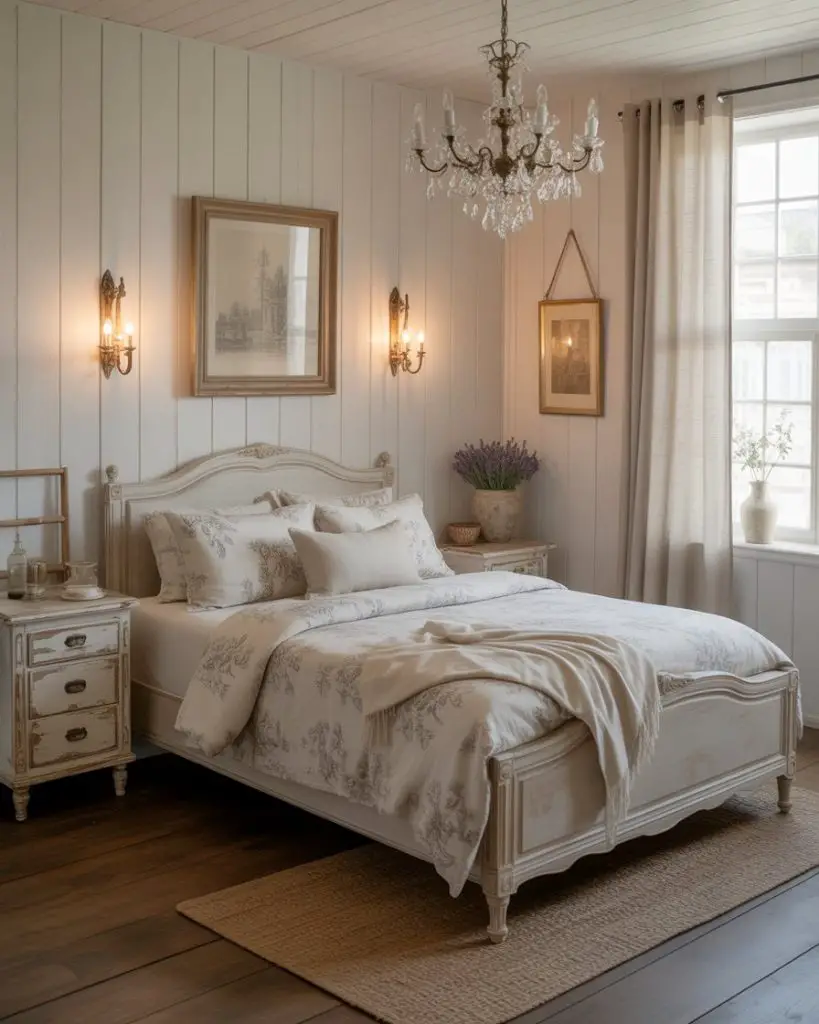 A French country cozy guest bedroom blends rustic European elements with comfortable American sensibilities. Think whitewashed wood furniture, toile prints in soft colors, linen bedding with ruffled edges, and vintage-inspired chandeliers. This aesthetic appeals to Americans drawn to European romance without the formality of traditional French design. The result feels collected, layered, and welcoming—somewhere guests can genuinely relax rather than worry about disturbing a perfect tableaux. Natural materials, distressed finishes, and soft feminine touches all contribute to the look.