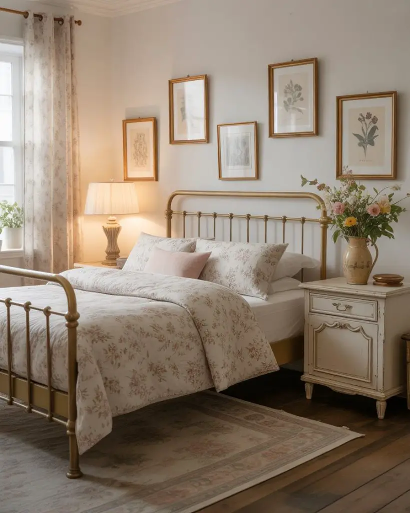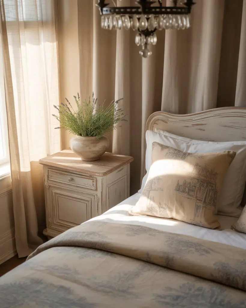 Where this works best: older homes with architectural character, suburban bedrooms where homeowners want European sophistication, and any space where feminine elegance feels appropriate. The style has enjoyed renewed interest as Americans seek alternatives to stark minimalism. Layer patterns carefully—toile, ticking stripe, and small florals all work together if you maintain a consistent color story. Add lavender or eucalyptus in simple vases; the French countryside association strengthens through these natural elements. A small writing desk with a vintage chair creates a romantic vignette that guests often photograph. Quality matters with this aesthetic—cheap furniture looks obviously wrong, while genuine vintage or well-made reproductions feel authentic and considered.