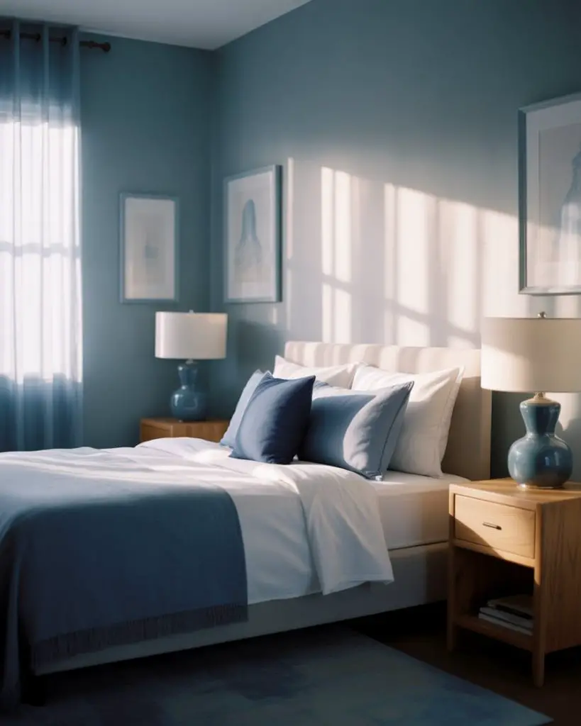 A blue color scheme creates instant tranquility in guest bedrooms, drawing on color psychology that Americans instinctively understand from coastal vacations and spa experiences. Soft blue-gray walls, navy accent pillows, or a faded denim duvet all tap into this calming effect. The color family works across design styles—from beachy casual to sophisticated traditional. Layer different blue tones rather than matching everything exactly; the subtle variation adds depth and prevents the room from feeling flat or predictable.
