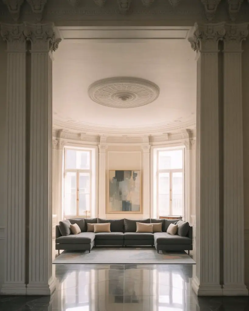 The neoclassical movement brings ornate details like carved moldings, classical columns, and symmetrical layouts into conversation with sleek modern furniture and contemporary art. This isn’t about recreating a palace—it’s about borrowing the grandeur of classical design while keeping things livable and fresh. Picture a living room with elaborate ceiling medallions paired with a minimalist sectional or fluted pilasters framing a modern media console. The contrast creates visual drama.