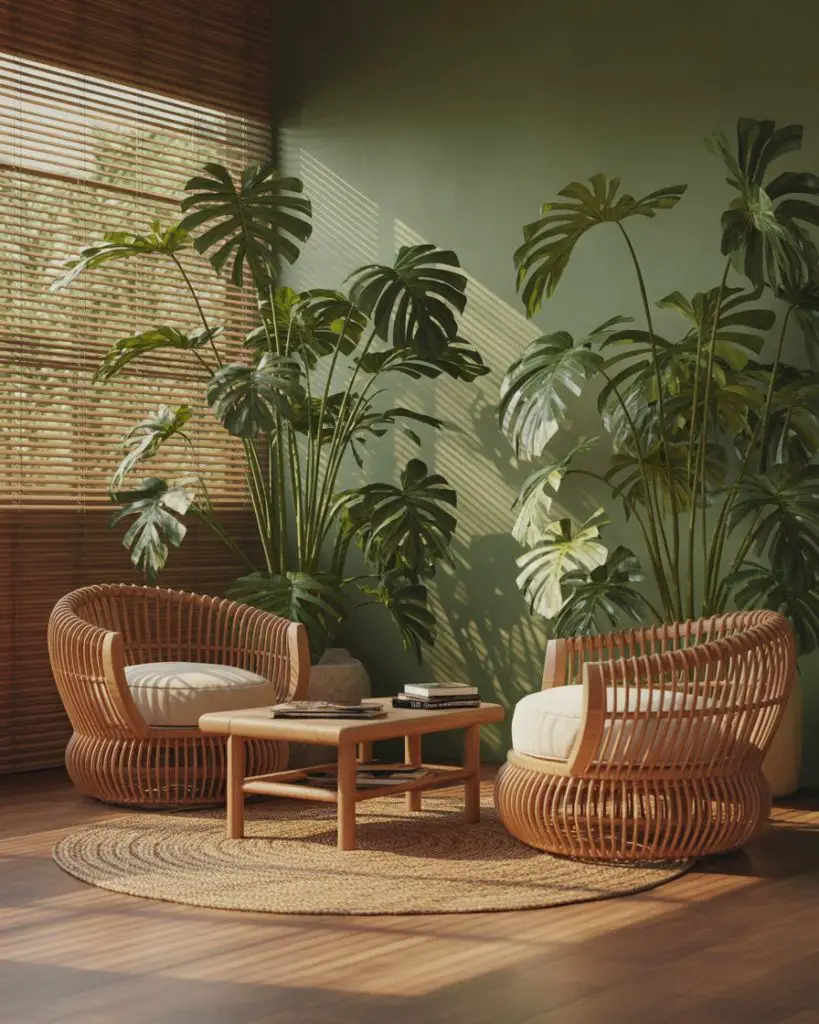 Bringing the outdoors in has never been more literal than in tropical-inspired living rooms that blur the line between interior and exterior. Oversized palm leaves, rattan furniture, and natural fiber rugs create a vacation-like atmosphere that’s especially appealing in warmer American climates. Pair these elements with green accent walls or wallpaper featuring botanical prints, and suddenly your living room feels like a permanent retreat.