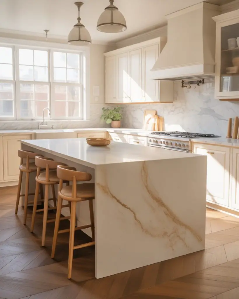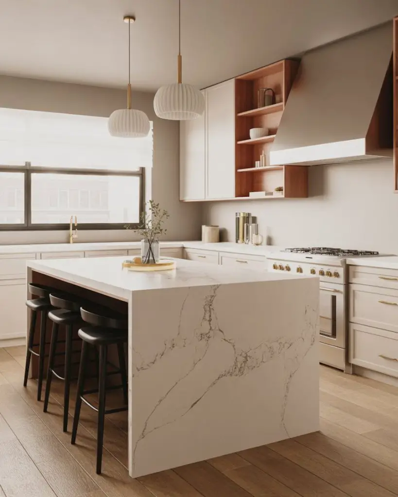 Extending countertop material down the sides of an island in a waterfall edge has become one of the most requested details in modern kitchen design. This treatment works with virtually any material—quartzite, quartz, marble, or even concrete—and creates a sculptural, furniture-like quality. The continuous flow of material from horizontal to vertical surface adds visual weight and sophistication, making the island feel like a intentional piece rather than just a functional work surface. It’s especially striking with heavily veined stone, where the pattern wraps around the edge.