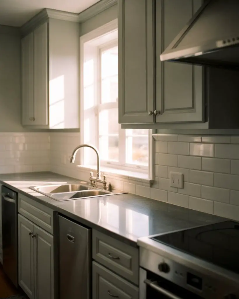 An integrated or undermount sink in the same material as the countertop creates a seamless, continuous surface that’s both beautiful and practical. This detail works especially well with quartz, concrete, or solid surface materials that can be fabricated into custom shapes. The lack of a raised rim means crumbs and water can be swept directly into the sink without catching on an edge—a small convenience that makes daily cleaning noticeably easier. The unified look also creates a cleaner, more modern aesthetic than traditional drop-in sinks.