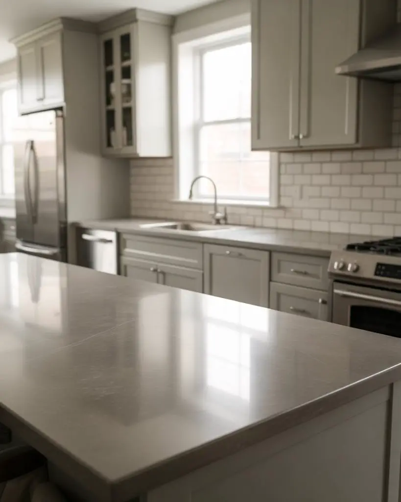 Practical insight: Grey quartz hides crumbs and dust better than white surfaces but doesn’t show water spots as obviously as black countertops. It’s the Goldilocks choice for busy families who want something attractive without constant maintenance. Many manufacturers now offer grey quartz with subtle veining or texture to mimic natural stone, giving you the look without the upkeep. Installation costs range from $50 to $90 per square foot, making it affordable for most remodeling budgets while delivering a high-end appearance.