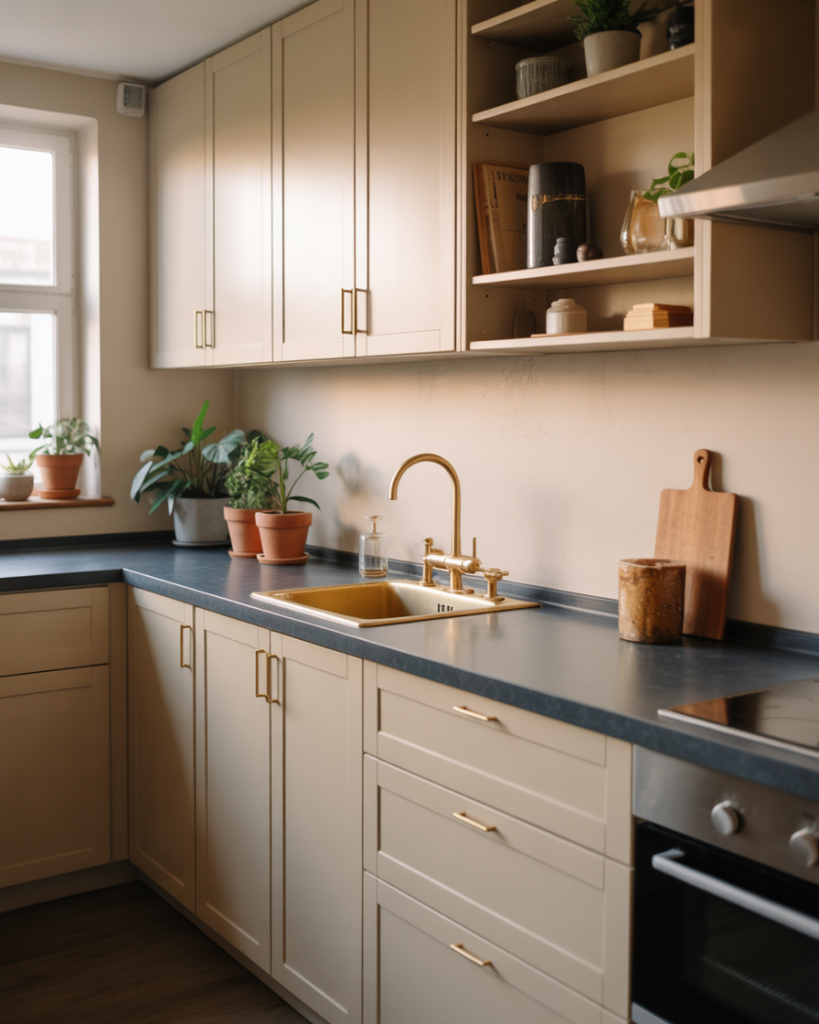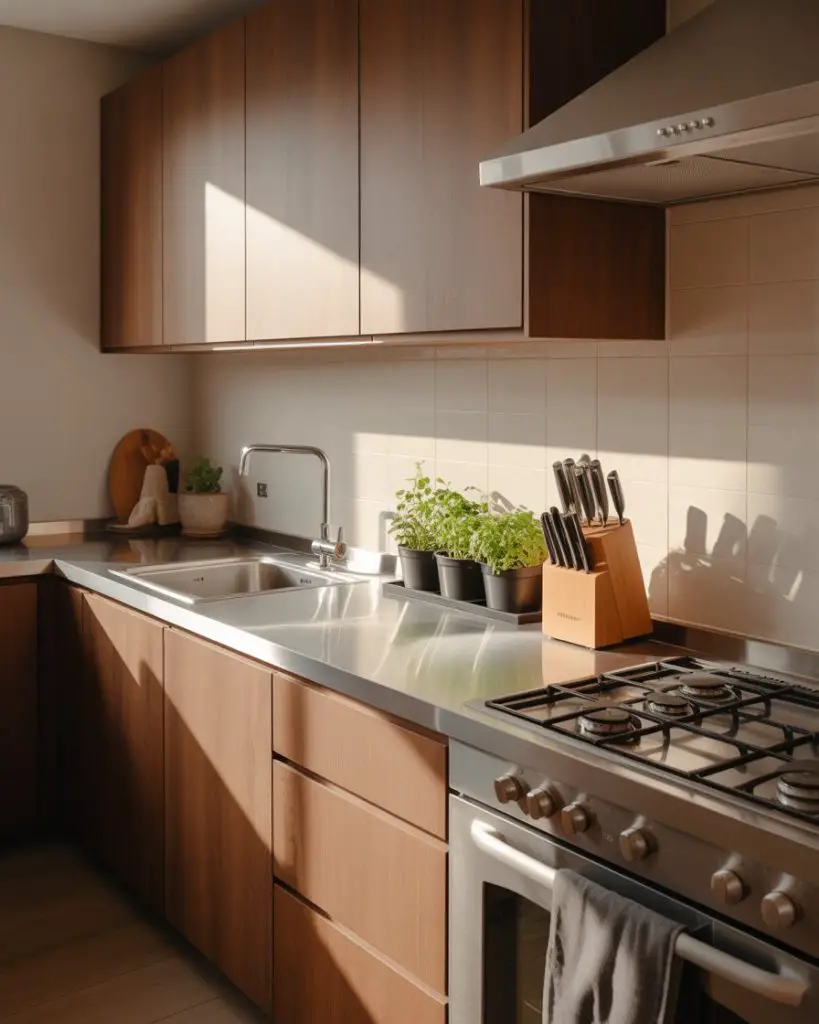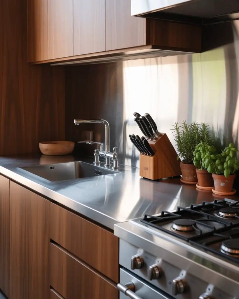 Design experts note that stainless steel works best in kitchens with strong architectural bones and a commitment to the industrial aesthetic—it can feel cold or clinical if not balanced with warm wood, textured fabrics, or greenery. Scratches and dents are inevitable, but many homeowners view these as part of the material’s character, like a well-used chef’s knife. Fingerprints show easily, so daily wiping is necessary. This choice is most popular in urban apartments and loft conversions where the restaurant-quality vibe feels intentional.