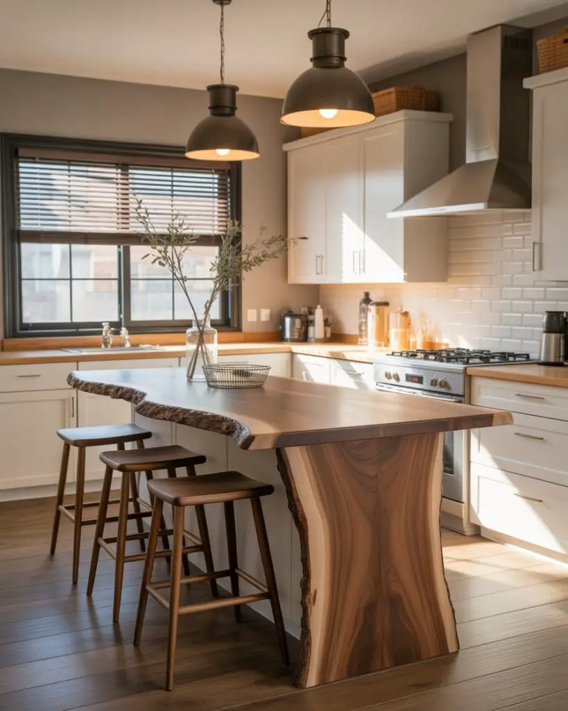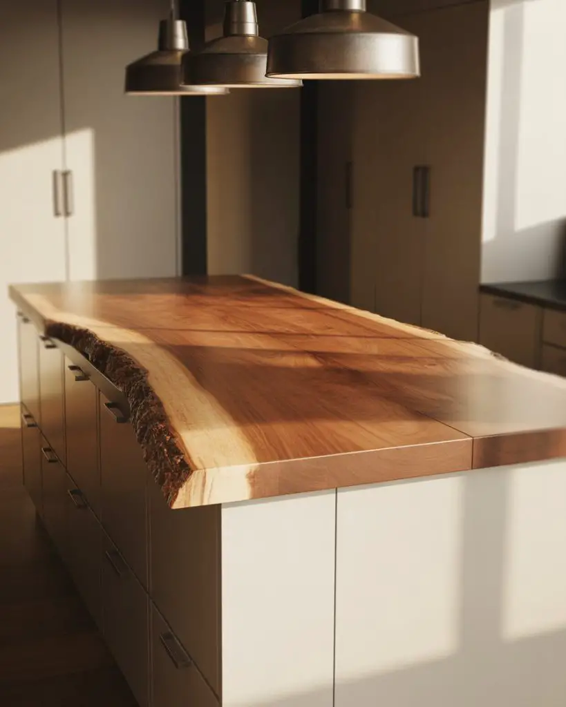 Live edge wood countertops celebrate the natural form of the tree, preserving the irregular, bark-edged perimeter for a rustic, organic look. This choice has become popular in mountain homes, cabins, and modern farmhouse kitchens where the connection to nature is a priority. The wooden surface adds warmth and texture, and no two pieces are alike—each slab tells its own story through grain pattern and natural imperfections. Live edge counters work particularly well on islands or breakfast bars where the sculptural edge can be appreciated from all sides.