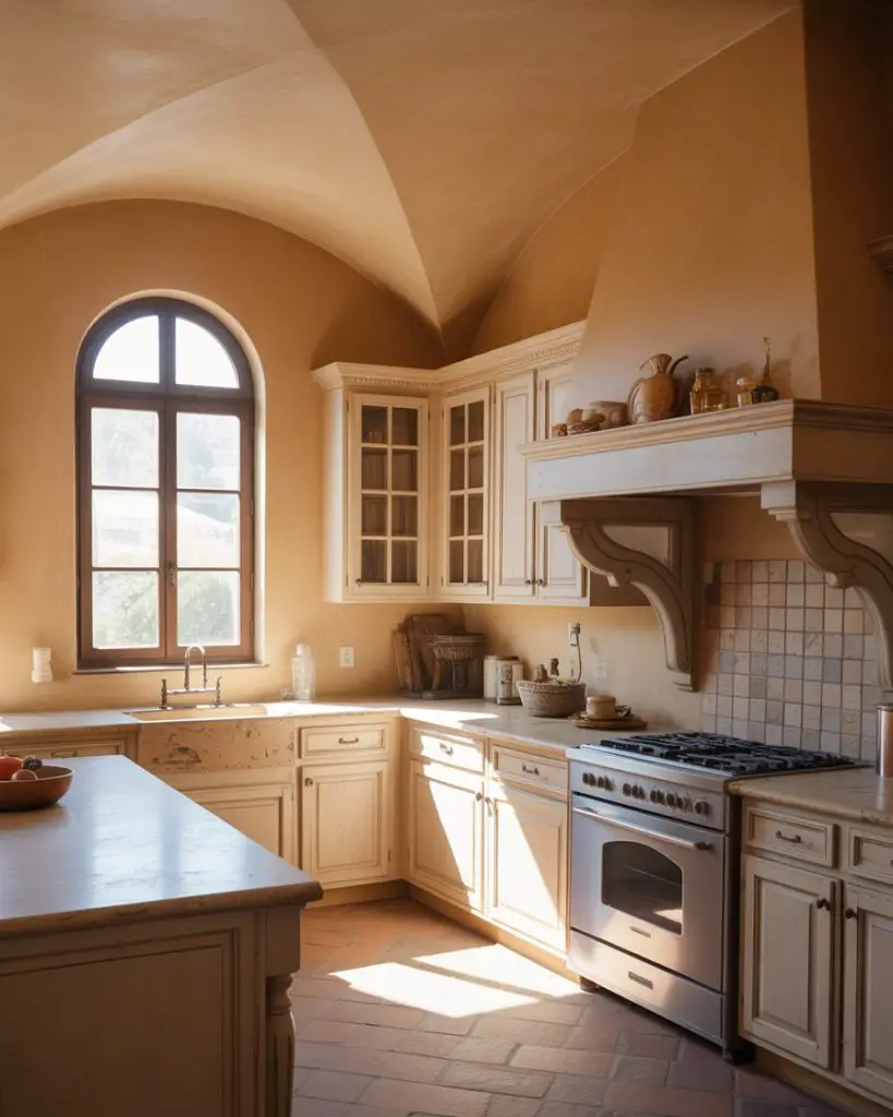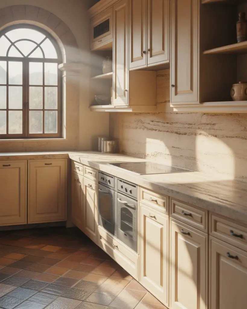 Travertine countertops bring a soft, Mediterranean quality to kitchens with their porous texture and warm cream to tan coloring. This natural stone has a distinctly different character than polished marble or granite—it’s matte, textured, and feels ancient rather than modern. The material works beautifully in kitchens with European or Old World influences, especially when paired with hand-painted tile, wrought iron fixtures, or rough-hewn wood beams. The styling approach should lean into the stone’s natural, imperfect beauty rather than trying to make it look sleek or contemporary.