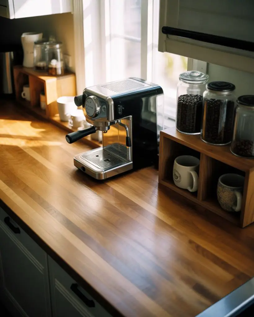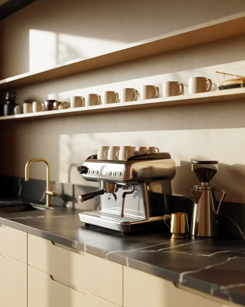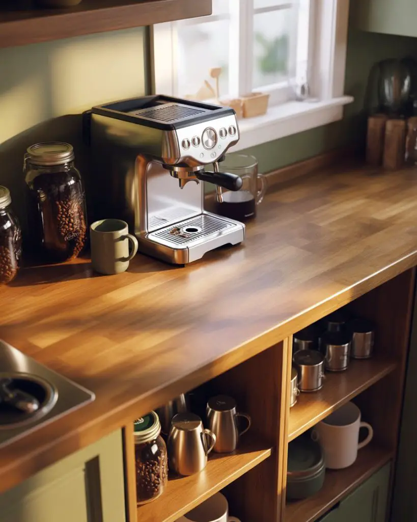 In real homeowner behavior, the coffee station has become the most-used spot in many kitchens—it’s the first stop in the morning and often the last at night. By giving this area its own identity with a special countertop material, you create a focal point that feels both practical and indulgent. Consider adding a small backsplash in complementary tile or continuing the marble up the wall for a luxe effect. This setup works especially well in open kitchens where the coffee area faces the living room, making it easy to chat with family while brewing.
