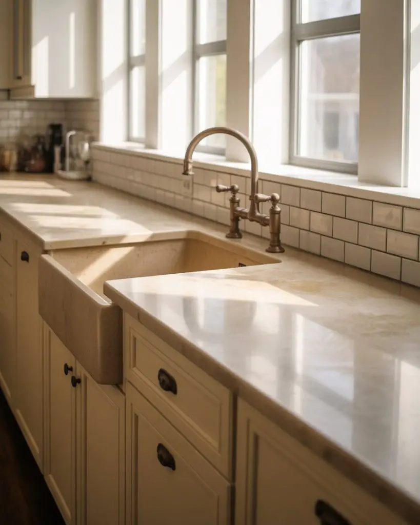Travertine is less common in American kitchens than granite or quartz, but it’s gaining appreciation among homeowners who want something different from the mainstream options. The stone is softer than granite and more porous than marble, so it requires sealing every few months and careful attention to spills. Many people fill the natural pits and holes in the stone for a smoother surface, though some prefer to leave them visible for added texture and character. This is a countertop for those who value patina and authenticity over pristine perfection.