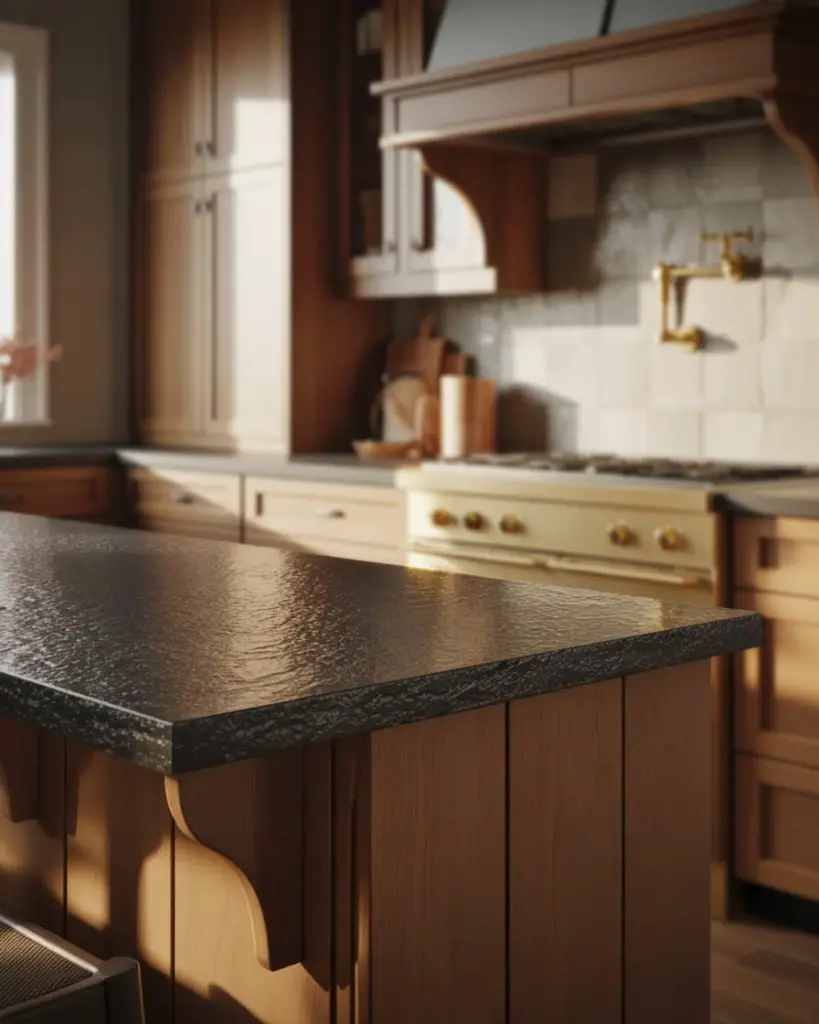 Moving beyond polished or honed finishes, leathered granite and quartzite offer a textured surface that hides fingerprints and adds subtle dimension. This finish process creates a slightly rough, pebbly texture that catches light differently than smooth stone, adding visual interest without bold pattern or color. It works particularly well on dark stones where polished surfaces can look too shiny or show every smudge. The leathered finish is popular in modern and transitional kitchens that layer different textures—smooth cabinetry, rough stone, soft fabrics.