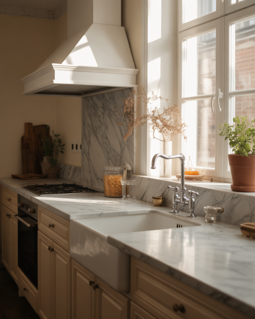 Choosing marble with a honed rather than polished finish changes the entire character of the stone, creating a softer, more matte appearance that ages gracefully rather than showing every etch mark. This approach appeals to homeowners who love white marble’s beauty but accept that it will develop a patina over time. The honed finish shows etching and staining less dramatically than polished marble, making it a more practical choice for kitchens that see real use. It’s particularly popular in European-inspired kitchens where imperfection is valued as part of the material’s character.