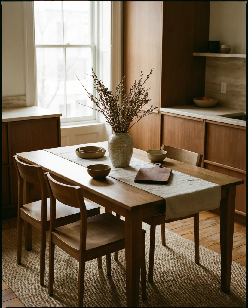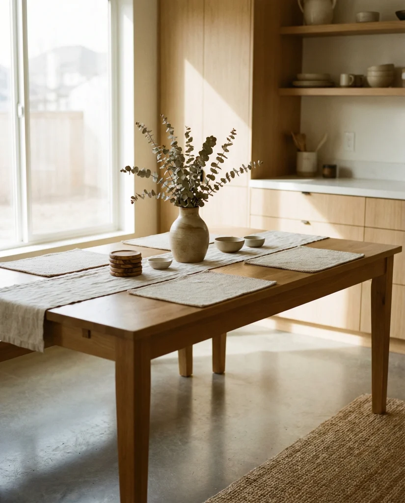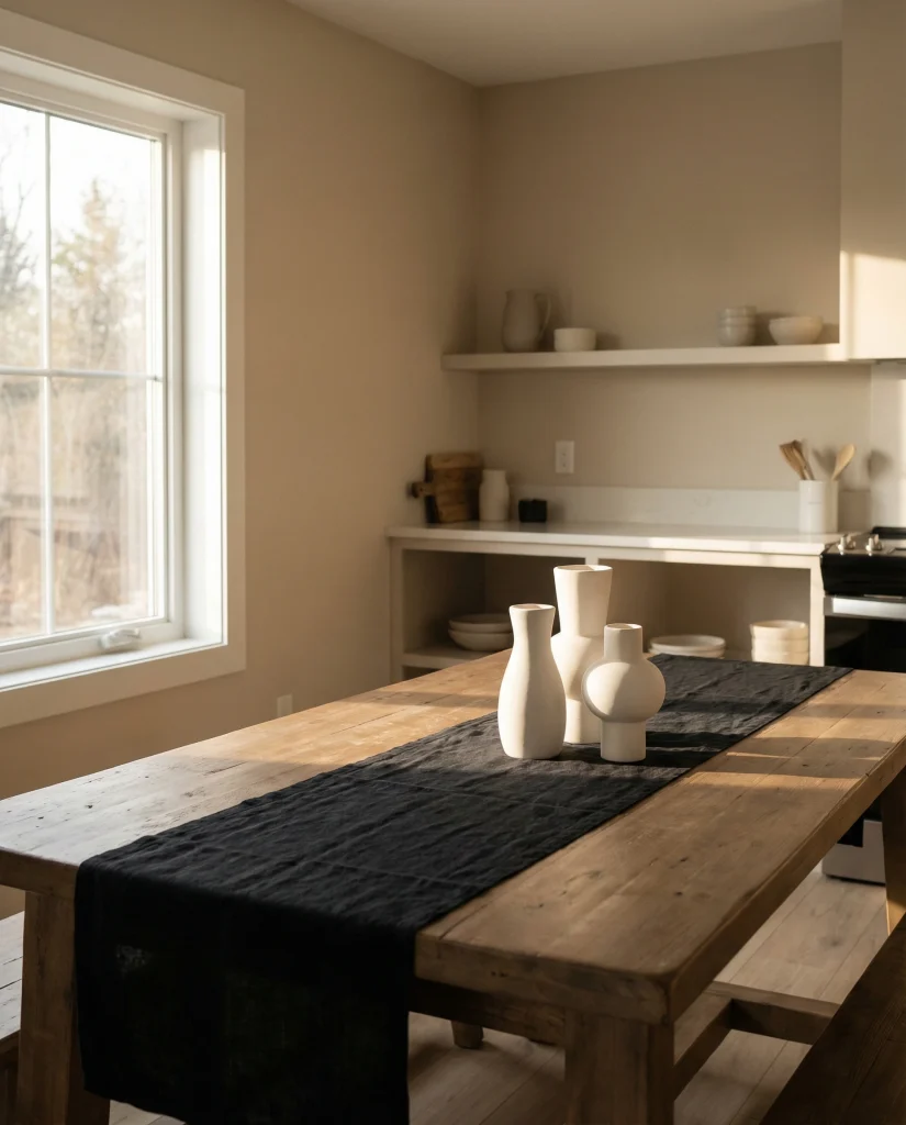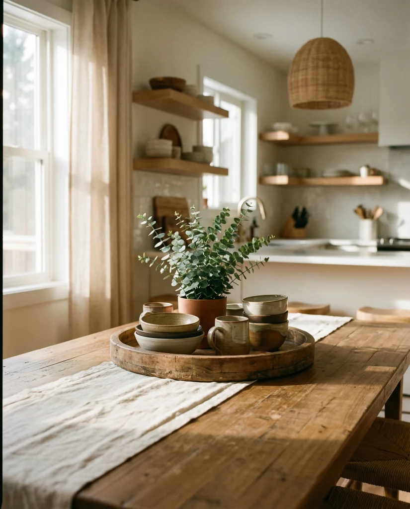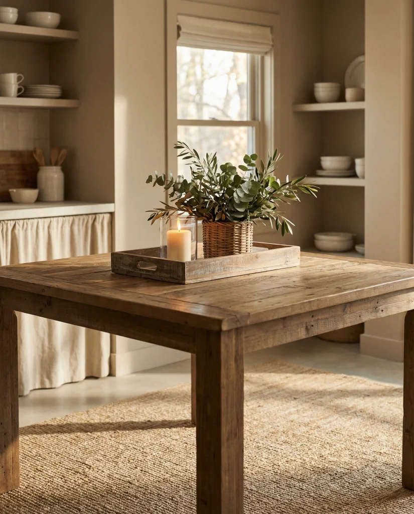 American lifestyle context: neutral palettes continue to dominate kitchens across the U.S., especially in open-plan homes where table decor needs to blend with living and dining zones without overwhelming the visual flow.