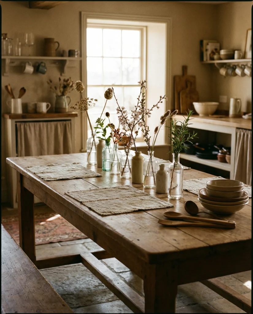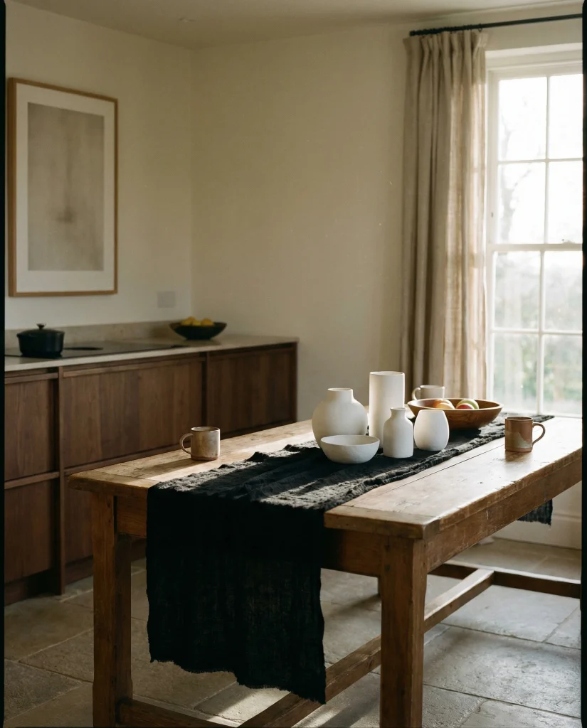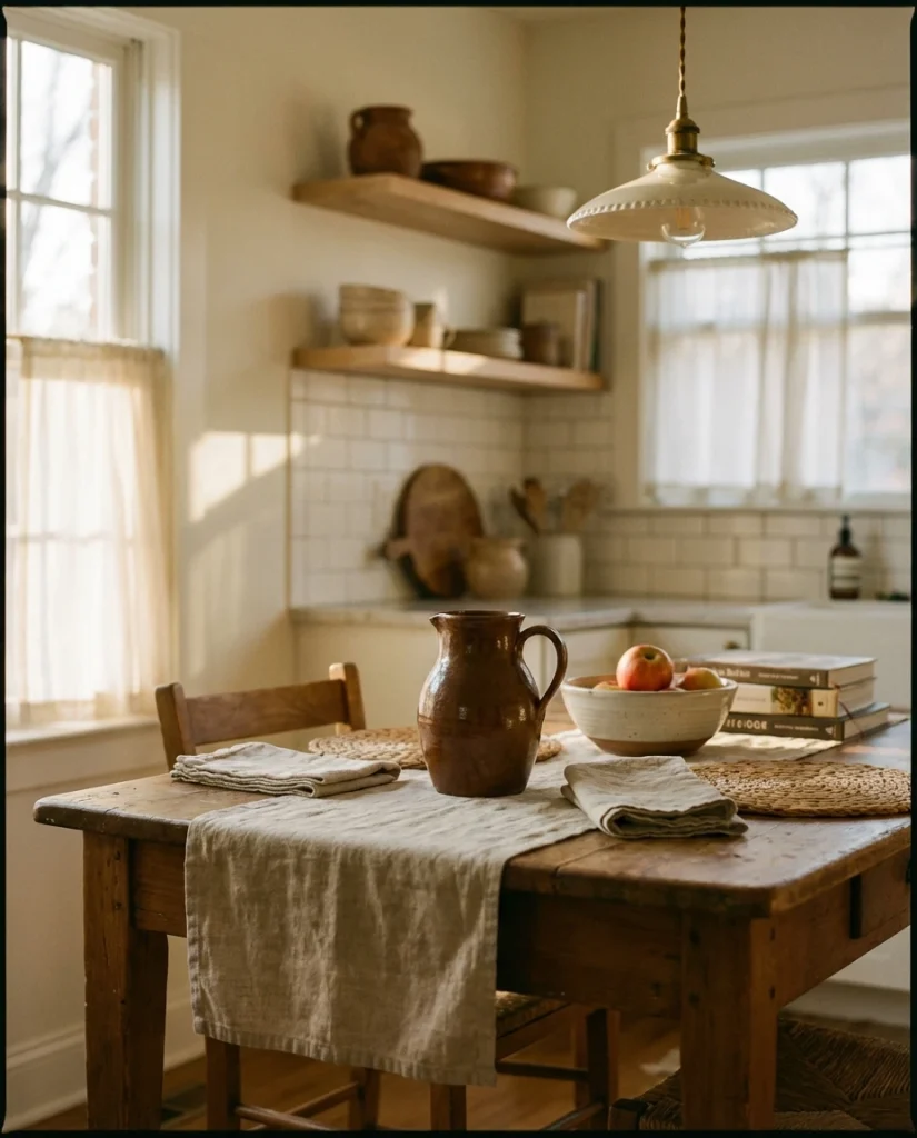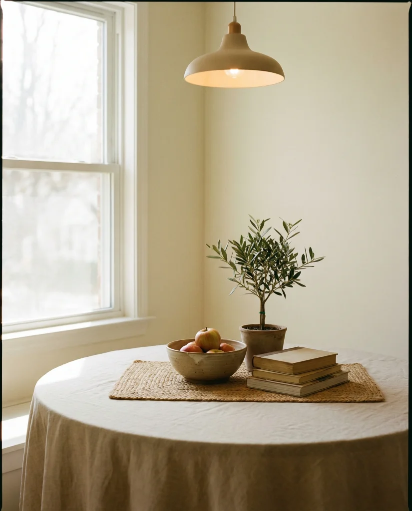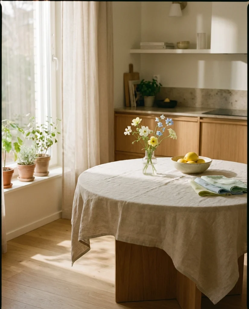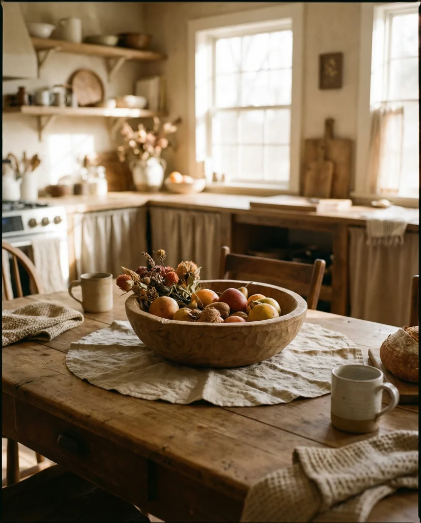 American lifestyle context: neutral palettes continue to dominate kitchens across the U.S., especially in open-plan homes where table decor needs to blend with living and dining zones without overwhelming the visual flow.