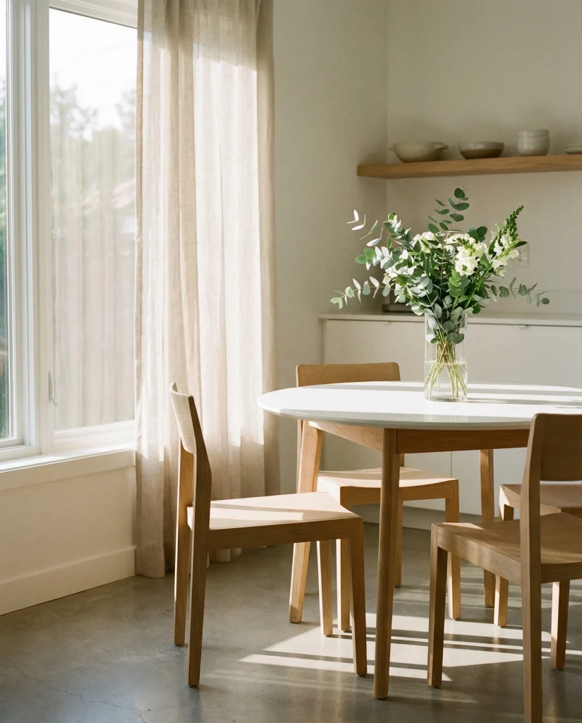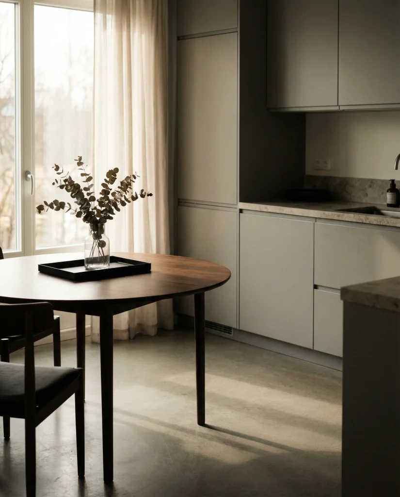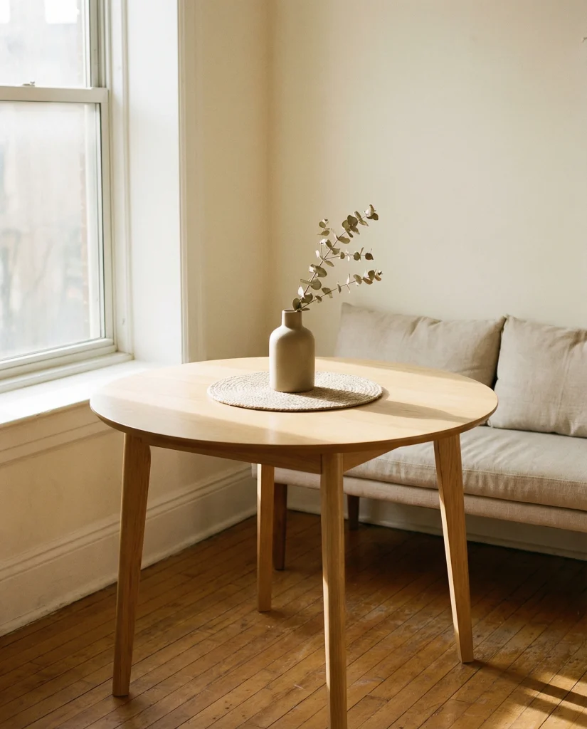 Where it works best: compact dining corners, breakfast nooks, and apartments where circulation matters. Round tables naturally invite movement, and a centered display ensures the decor stays visually calm even in tighter floor plans.