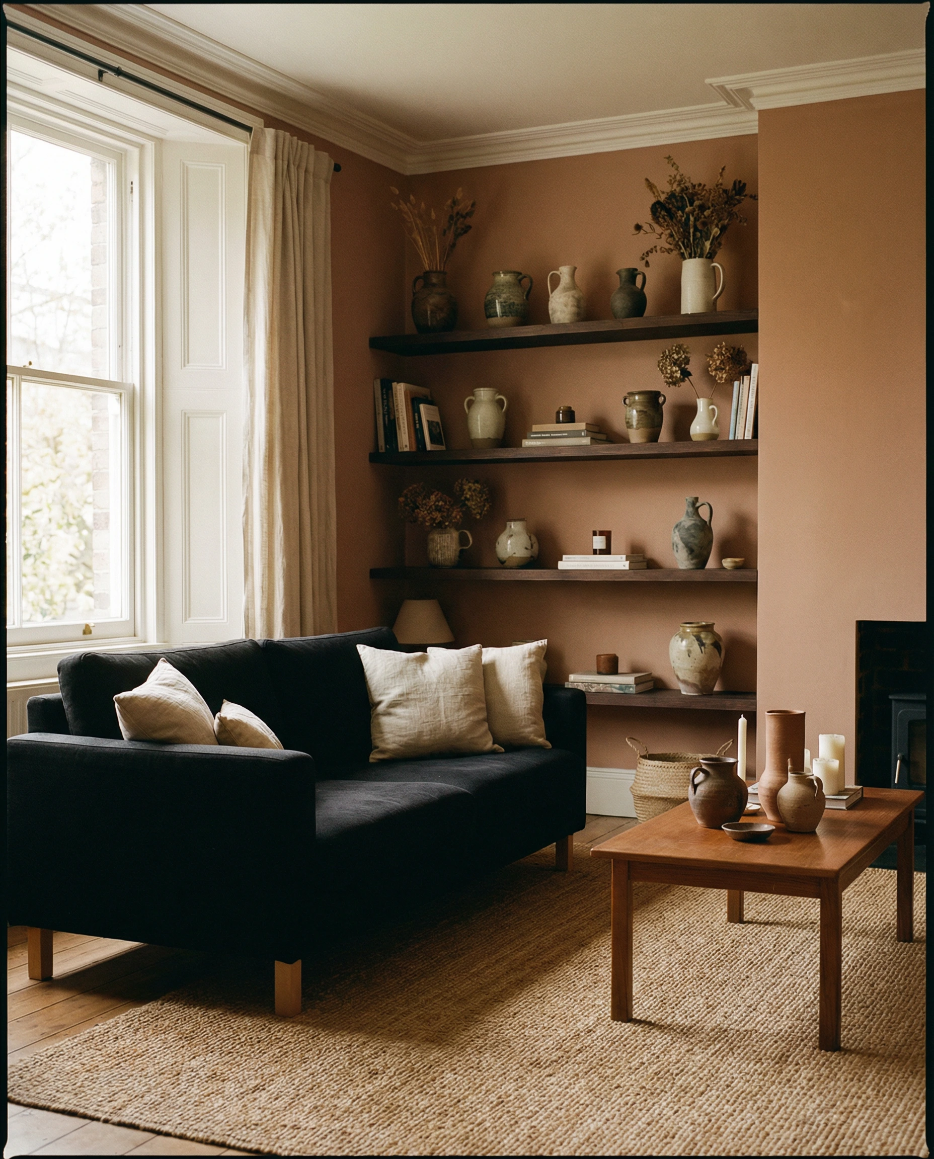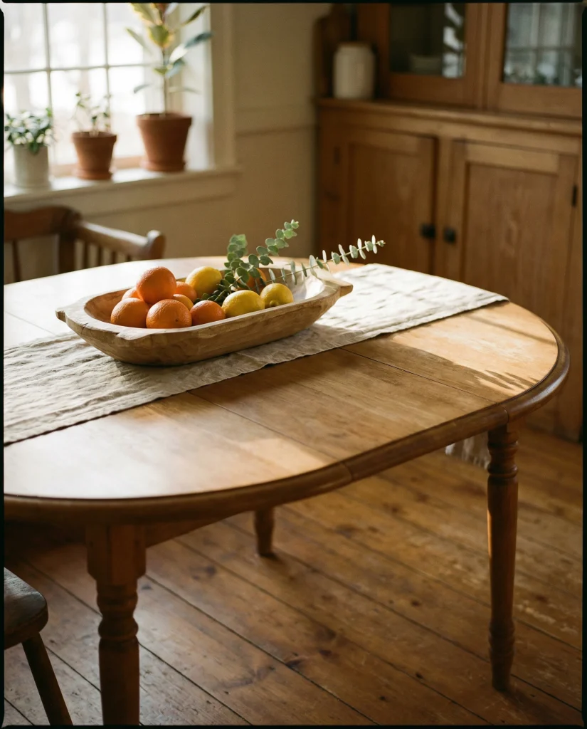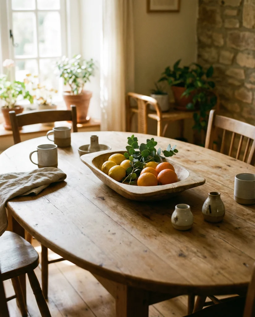 An oval table pairs beautifully with a shallow wooden bowl filled with citrus or dried stems. The rounded forms echo each other, creating a gentle, harmonious composition that feels warm and approachable.
