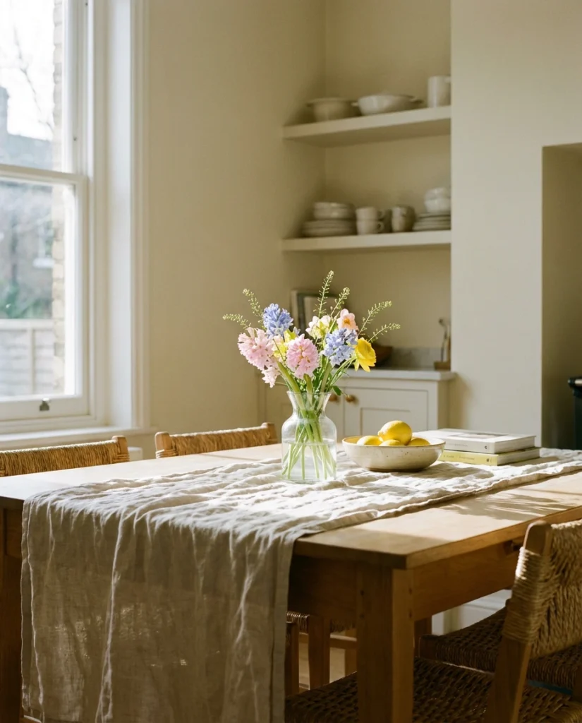 A cute spring setup—think small blooms, a soft linen, and a tiny centerpiece everyday accent—refreshes the table without heavy seasonal commitment. Keeping everything light preserves a breezy, optimistic tone.