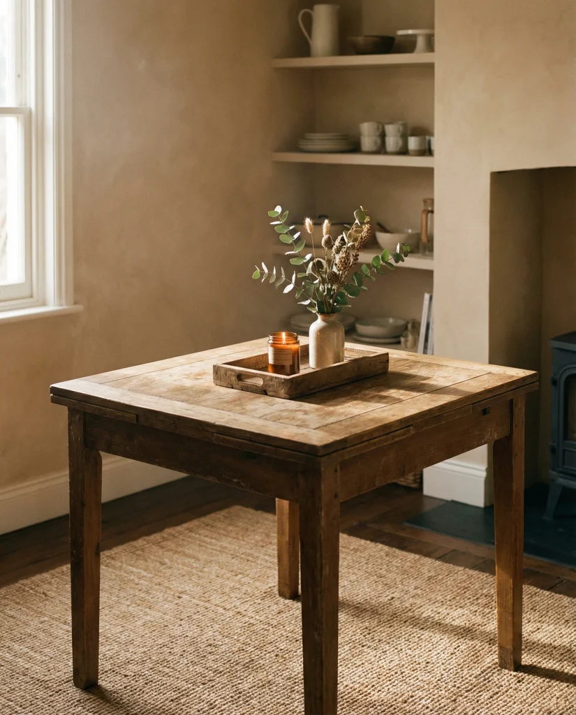 A square table loves structure, and a rustic wooden tray anchors the scene perfectly. Layering a candle, a sprig of greenery, and a ceramic piece creates a balanced grid-like feel that suits the tabletop shape.