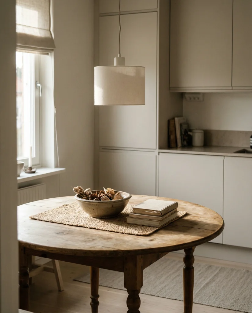 Styling a round table often looks best when everything radiates from a central point. A small ceramic bowl paired with a short stack of cookbooks creates symmetry that feels effortless. Adding a hint of rustic charm through woven elements keeps the look relaxed but intentional.