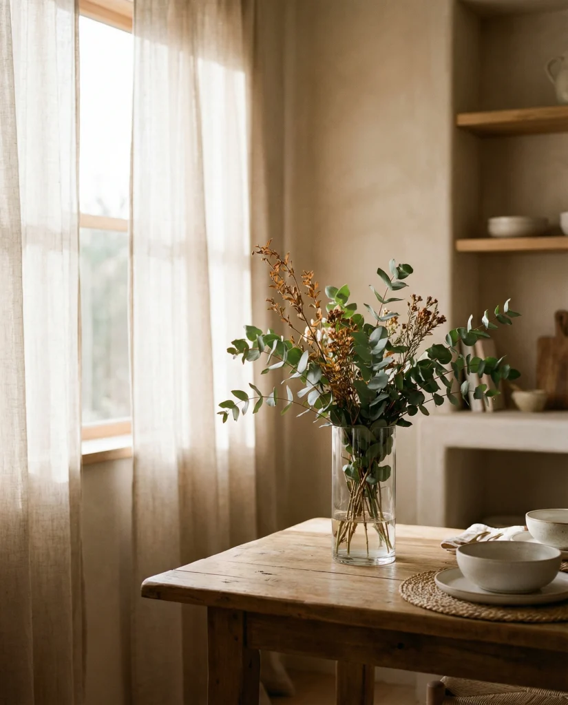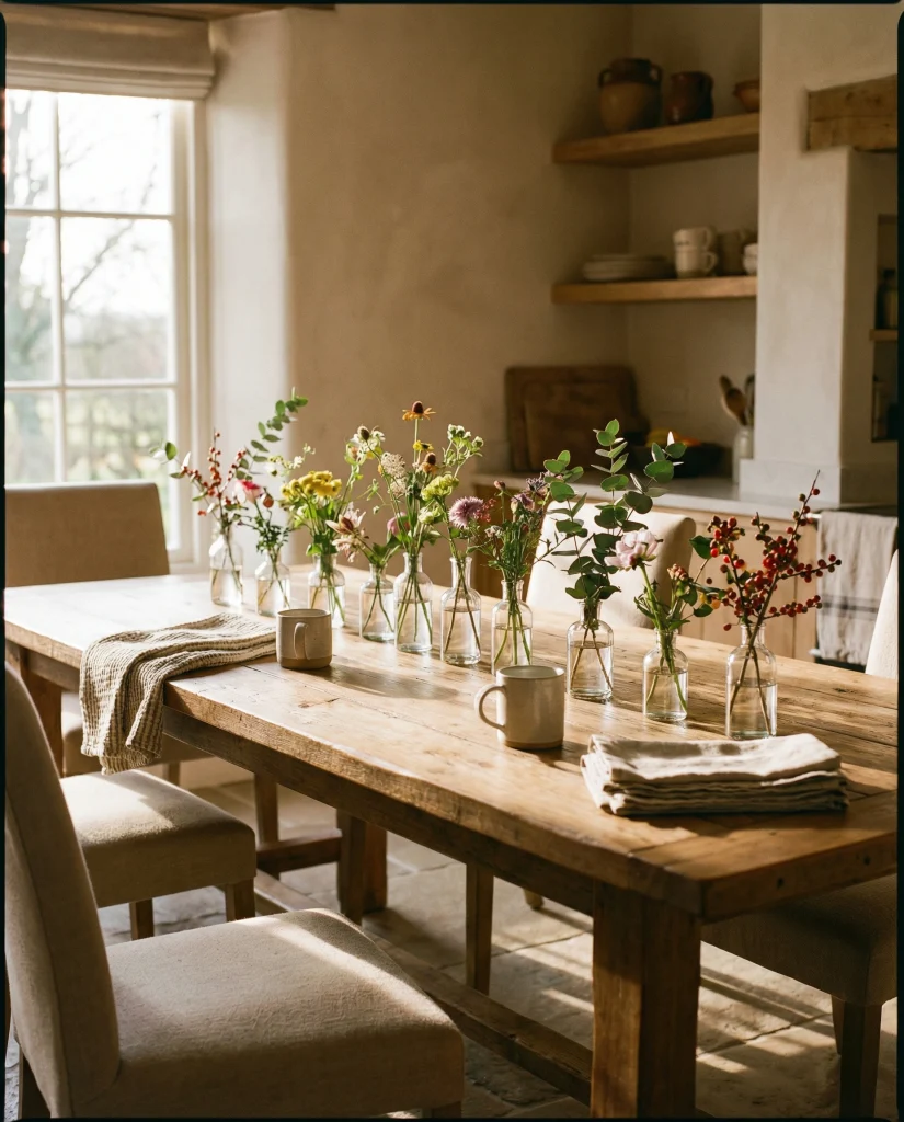 A long arrangement on a warm wood table—like a line of bud vases or seasonal stems—keeps the table feeling active throughout the year. It’s a simple, flexible formula suited for frequent refreshers.