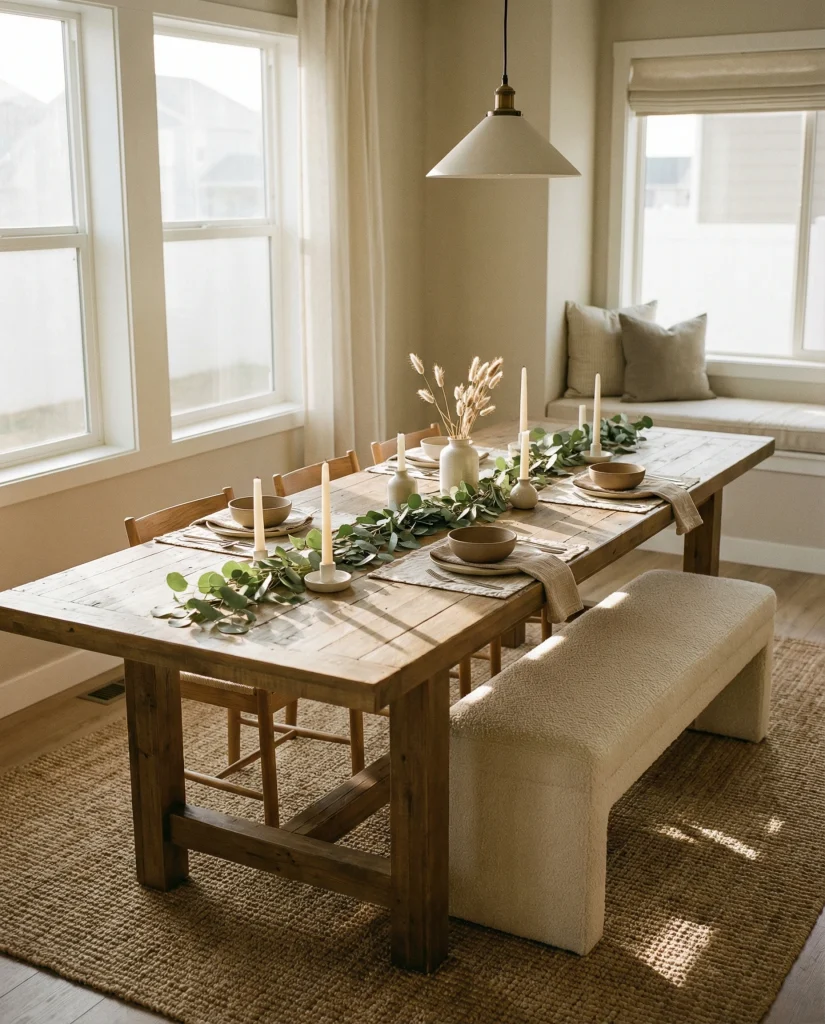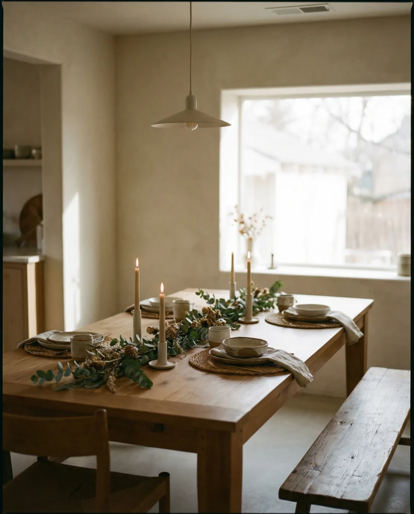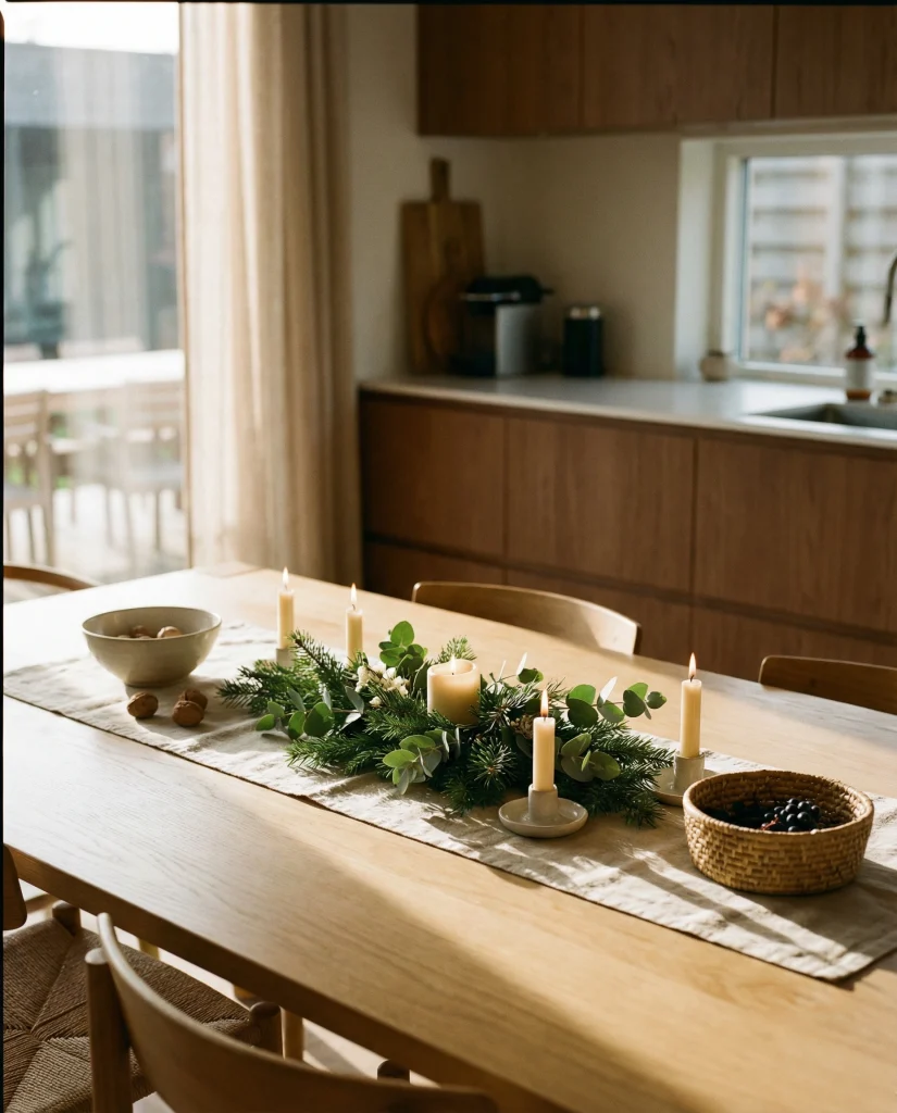 A holiday-ready centerpiece styled with subtle Christmas greenery or metallic accents shifts the room instantly without overwhelming your everyday palette. Keeping the elements low and compact ensures easy dining flow.