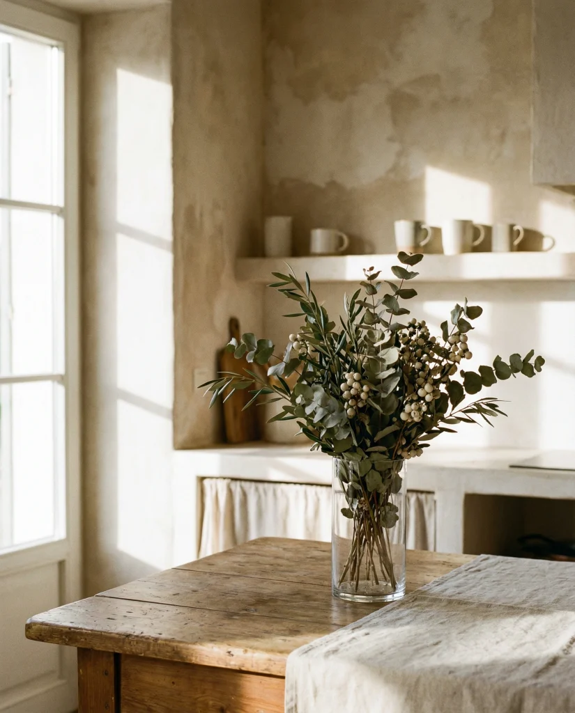 A layered arrangement built around a low-profile centerpiece brings calm, organic structure to the room. Mixing small vessels, greenery, and a touch of wood keeps the table grounded without blocking sightlines. This look fits modern, casual kitchens craving warmth without clutter.