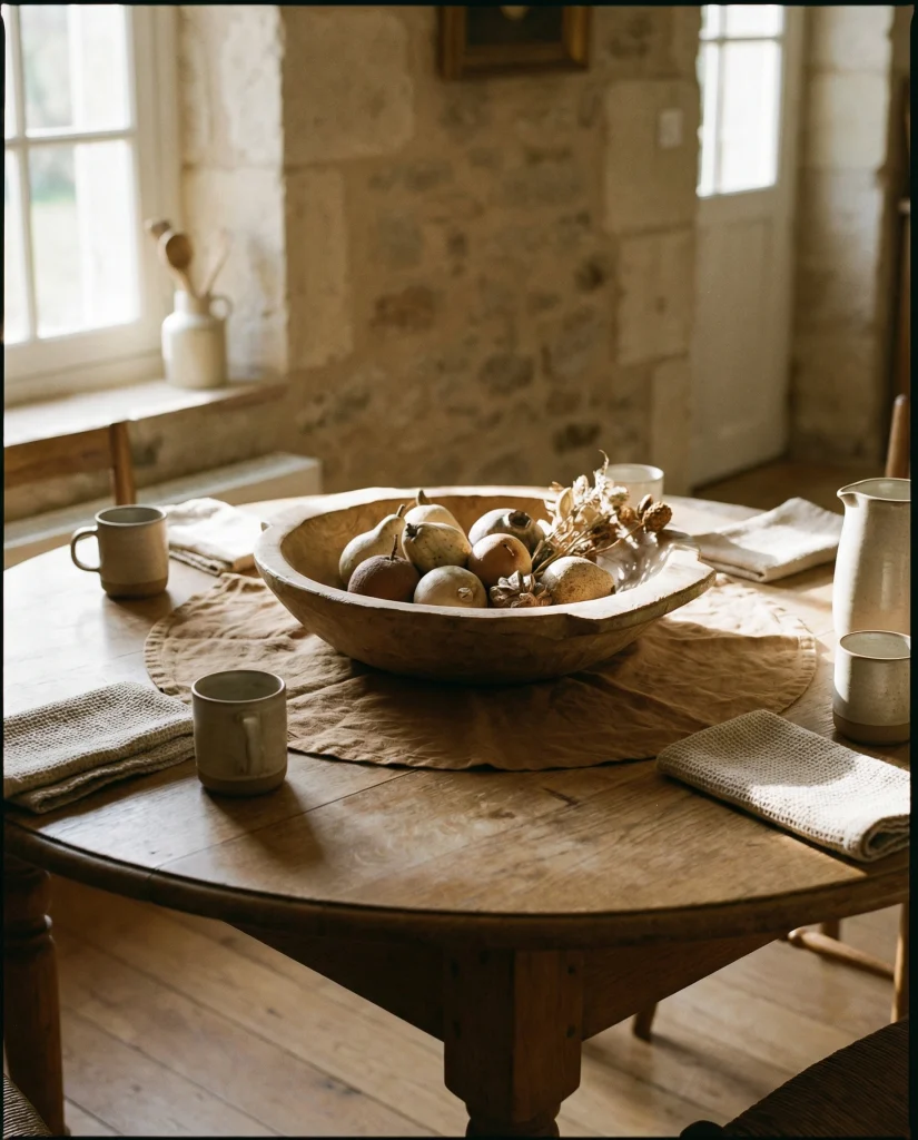 A wooden bowl filled with faux or dried fruit or small branches or oat quills adds grounding warmth. The pieces are kept soft with a placemat or cloth for a table that stays set with table linens. A bowl of fruit and a small placemat balance a neat table. A wooden texture and fruit are a perfect combination for a table that adds. A small bowl helps to balance while still maintaining neutral spacing. A wooden table. \\”everyday meals\\”