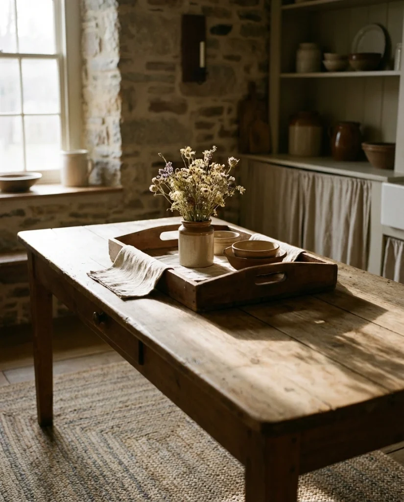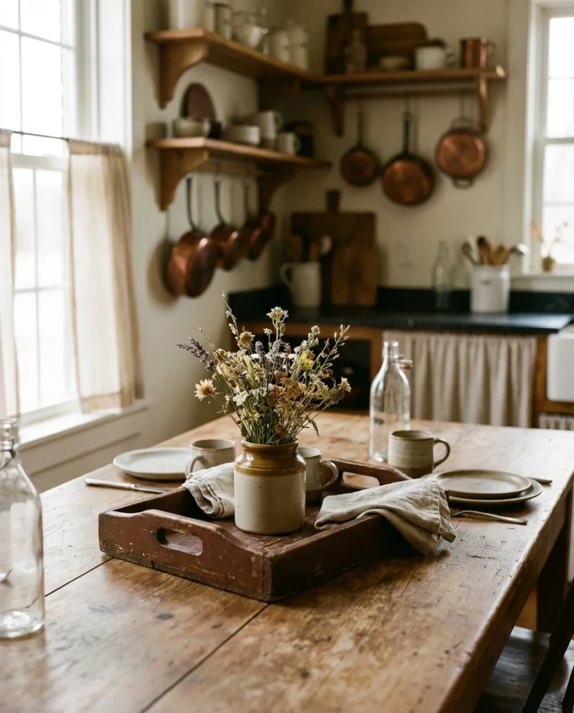 A soft country-inspired vignette—vintage crock, small flowers, and a brown wood tray—brings a touch of nostalgia. The mix of worn textures and simple shapes creates a lived-in charm that works beautifully in casual American kitchens.