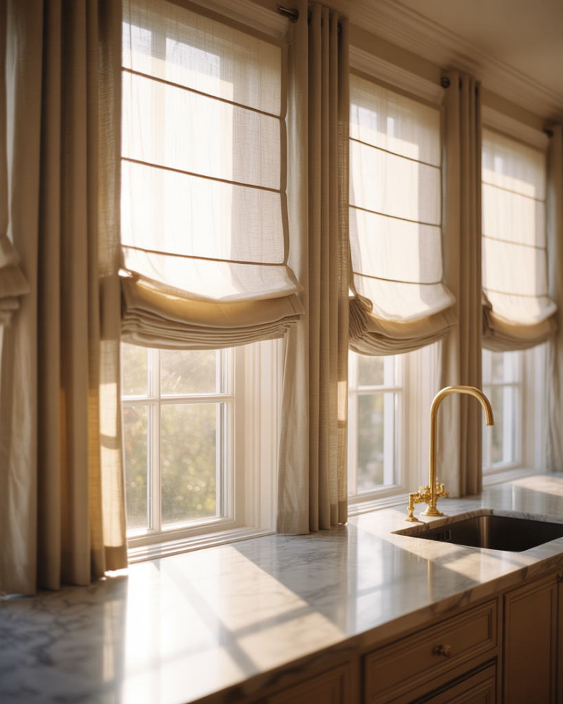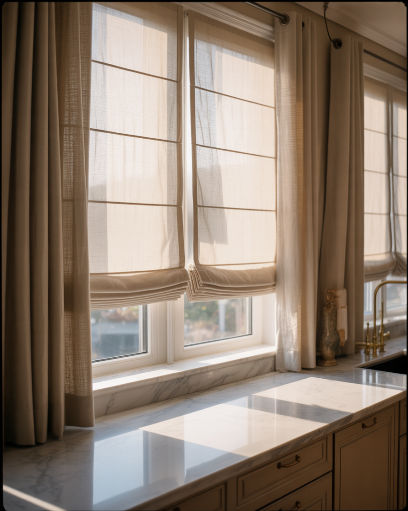 The double-layer approach has become a go-to solution for homeowners who want flexibility throughout the day, particularly in kitchens with large windows facing busy streets or neighboring properties. Soft linen curtains for the outer layer provide texture and warmth during daylight hours, while a mounted Roman shade underneath handles privacy concerns after sunset. This combination works beautifully in transitional and farmhouse-style kitchens where you want that breezy, lived-in aesthetic without sacrificing control over sightlines.