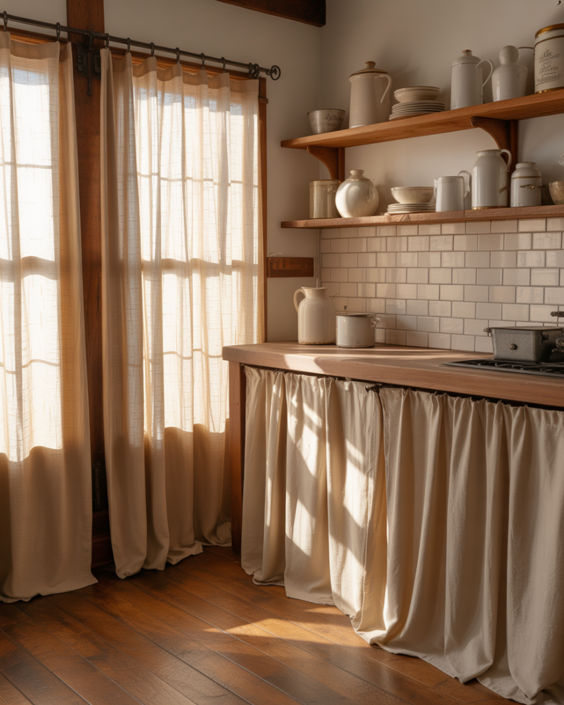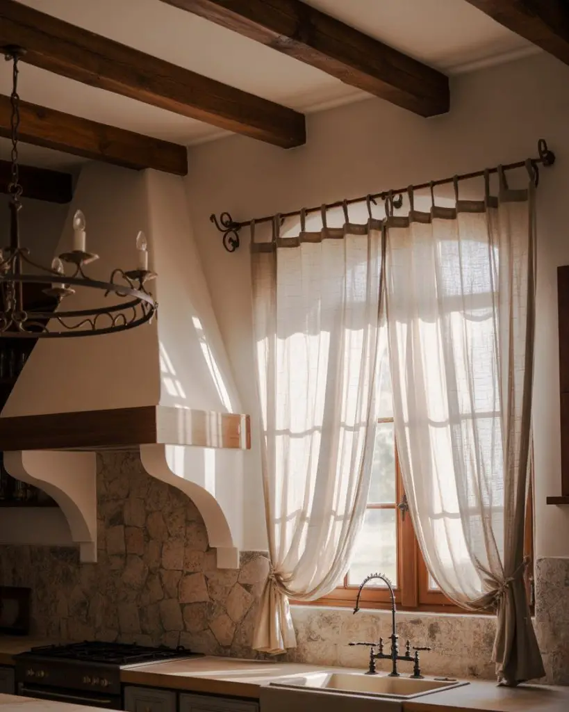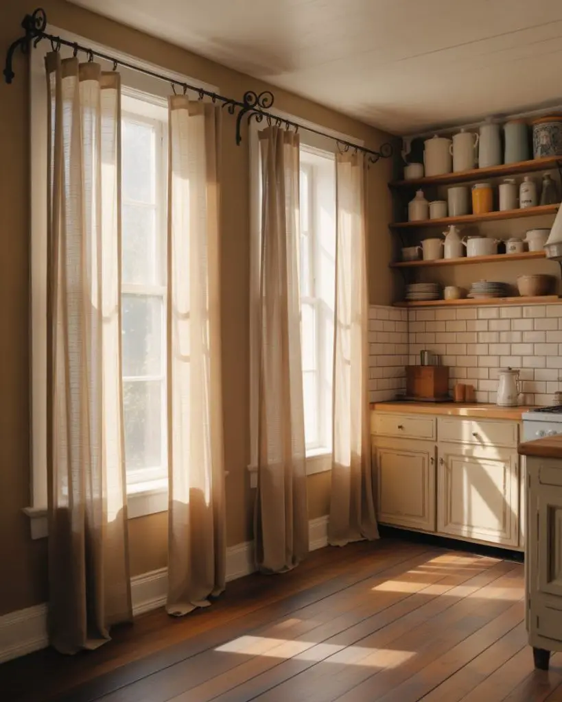 The curtains for long windows trend has been reimagined through cafe-style installations that extend all the way to the floor while maintaining that charming bistro aesthetic. Rather than stopping at the sill, these panels run the full height of double windows or French doors, creating elegant vertical lines that make ceilings feel higher. Mounted on decorative iron or brass swing-arm rods, they offer the nostalgic appeal of European cafes while providing practical light filtering for modern American kitchens.