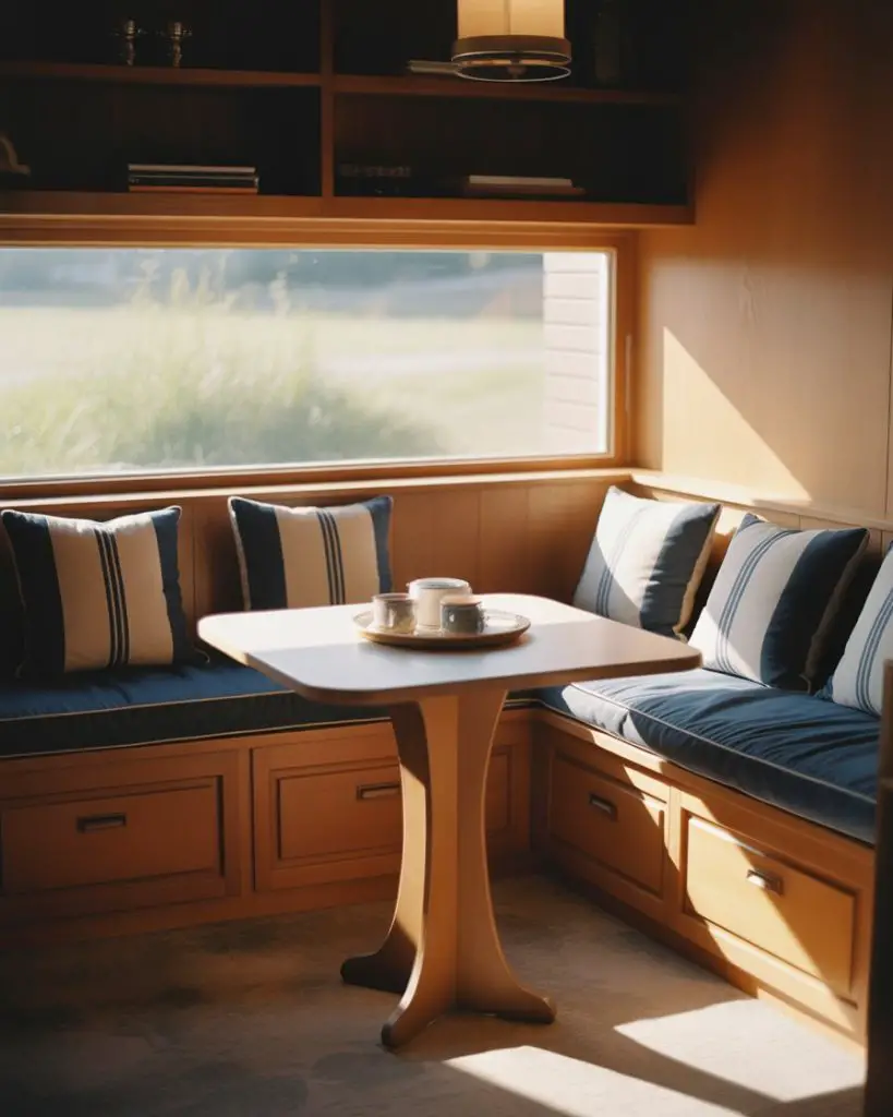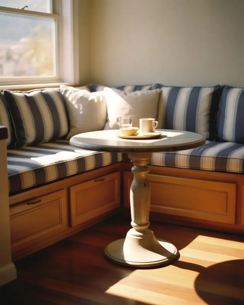 Designing around low windows by incorporating built-in banquette seating creates multifunctional breakfast nooks that maximize awkward kitchen footprints. Cushioned benches with lift-top storage compartments underneath make use of space that standard cabinetry can’t accommodate, while the windows themselves often require only sheer panels or no treatment at all since the low positioning naturally limits sightlines from outside. This solution works particularly well in tiny urban kitchens where separate dining areas aren’t feasible and every square foot must serve multiple purposes.