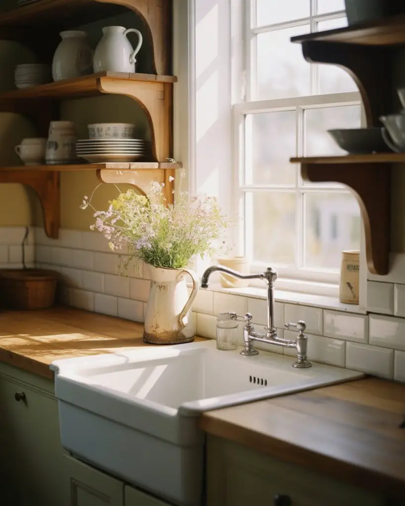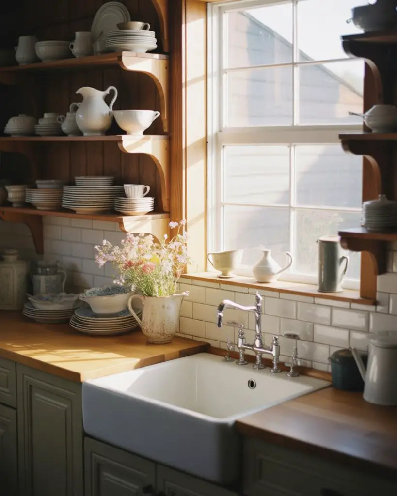 Expert commentary from kitchen designers suggests this configuration works best when the window is centered precisely over the sink rather than offset—even a few inches of asymmetry creates visual tension that bothers people subconsciously every time they approach the sink. The shelving should be deep enough (10-12 inches minimum) to accommodate dinner plates and serving bowls without items appearing crammed or precarious, which undermines the casual elegance this look is meant to convey.