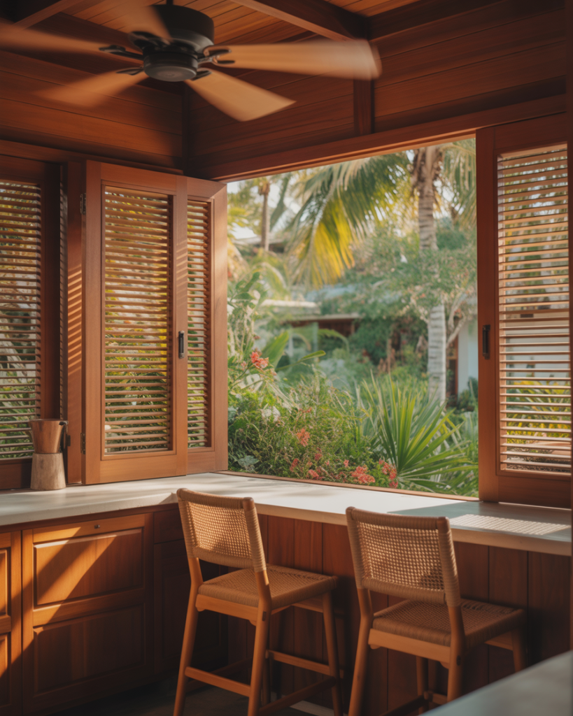 The Kerala tradition of adjustable wooden slat windows has found new appreciation in American kitchens seeking natural ventilation without screens or moving parts. These jalousie-style panels feature horizontal wood slats that tilt open in unison via a simple crank mechanism, allowing breeze circulation while maintaining privacy and rain protection. They’re particularly suited to covered porch kitchens or screened outdoor cooking spaces in Southern states, where year-round temperate weather makes permanent window glazing less essential than airflow control.