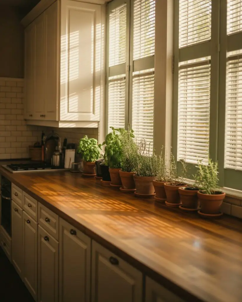 Where it works best is in homes where the kitchen serves as a genuine gathering space rather than just a cooking zone—plants signal permanence and care, inviting people to linger over coffee or homework rather than rushing through meals. The key maintenance trick involves rotating pots weekly so all sides receive even light exposure, preventing that lopsided growth that makes installations look neglected and amateur within months of setup.