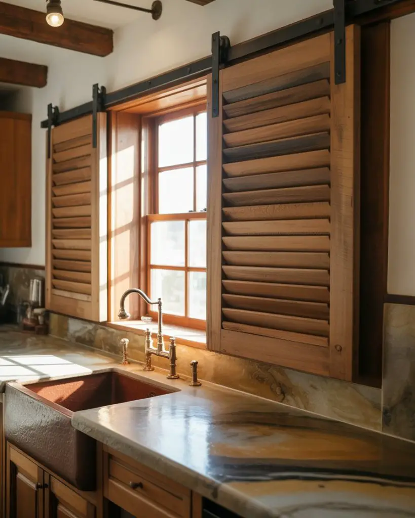 Interior sliding shutters mounted on barn door hardware provide flexible light control for large kitchen windows without the floor space requirements of swinging shutters or the visual bulk of heavy drapes. The shutters slide along wall-mounted tracks, stacking neatly to one side when open or covering the entire window when closed. This solution works particularly well in rustic and modern farmhouse kitchens where the industrial hardware doubles as decorative sculpture, especially when crafted from reclaimed wood with visible grain patterns and authentic weathering.