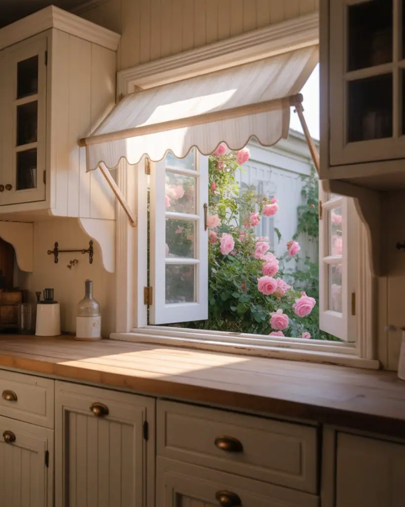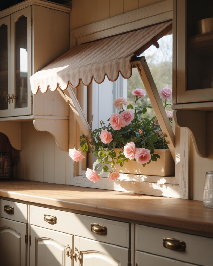 Awning-style windows that hinge at the top and open outward have been enhanced with scalloped or arched bottom edges and decorative exterior trim that evokes cottage and storybook architecture. These windows provide rain-protected ventilation since they can remain open during light precipitation, making them ideal above sinks or food prep areas where steam and cooking odors need continuous venting. Interior treatments are minimal—typically just a simple valance or no covering at all, since the architectural details of the window itself provide sufficient visual interest.