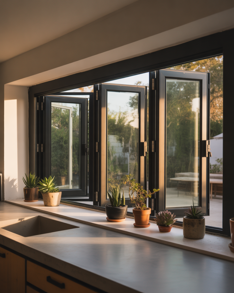 The indoor-outdoor kitchen trend has made outdoor serving windows incredibly popular in suburban and rural homes with patios or deck access. These operable windows fold completely open to create a bar-style pass-through, blurring the line between cooking and entertaining spaces. When closed, retractable screens or louvered shutters protect against insects and weather while maintaining airflow—essential for kitchens in humid Southern states or coastal regions where cross-ventilation prevents moisture buildup and keeps energy costs manageable.