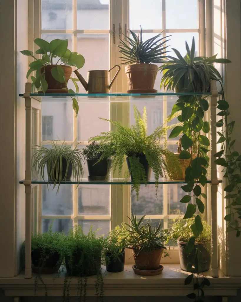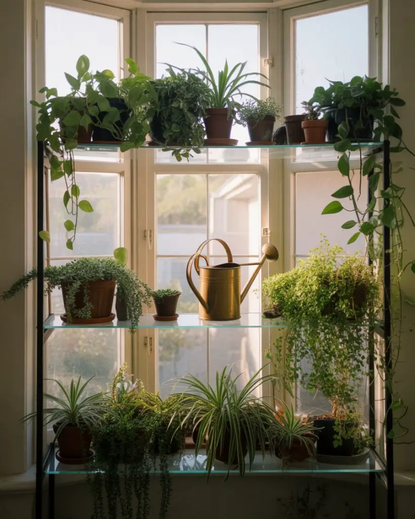 8. Trailing Plant Shelves Across Bay Window Spans