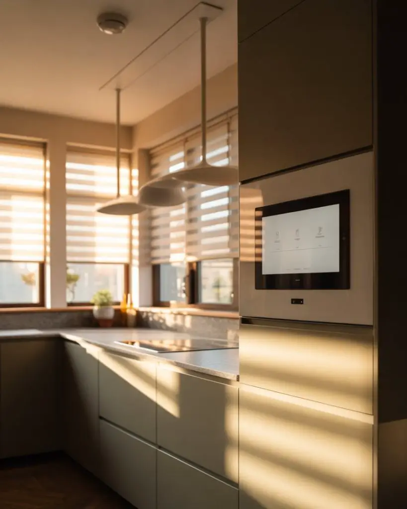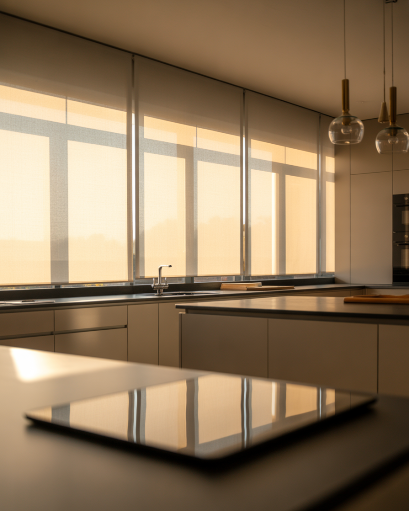 Smart home integration has made roller blinds the practical choice for kitchens where hands-free operation matters during messy cooking sessions. Mounted inside the window frame, these sleek shades raise and lower via smartphone apps or voice commands, with solar-blocking fabrics that reject heat while preserving outward views. They’re especially valuable in west-facing kitchens where afternoon sun creates unbearable glare on digital screens and stainless appliances, making meal prep uncomfortable without constant squinting or repositioning.