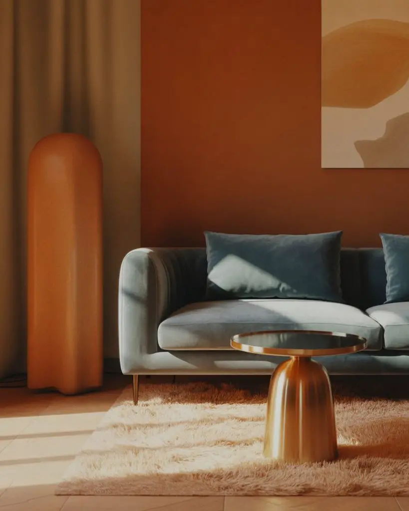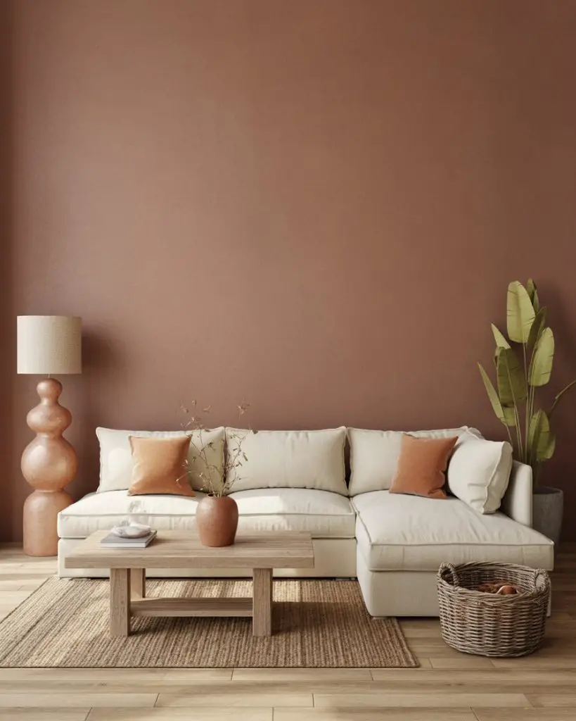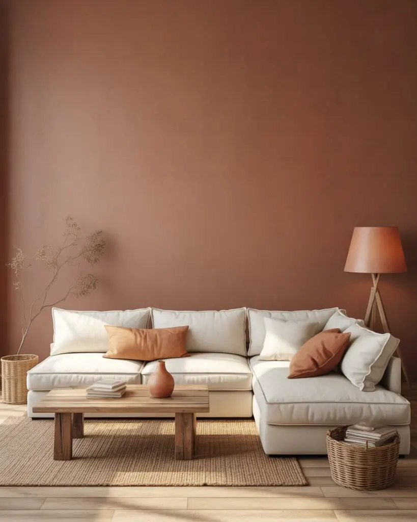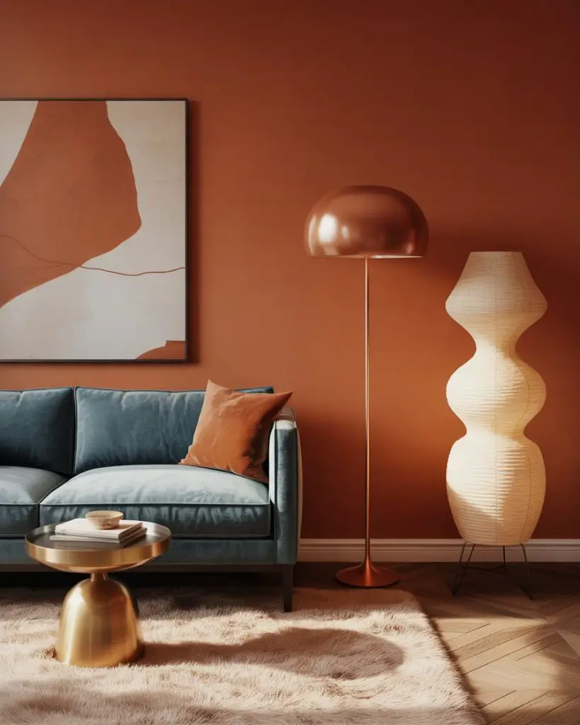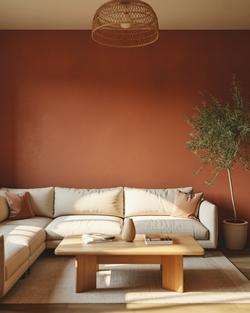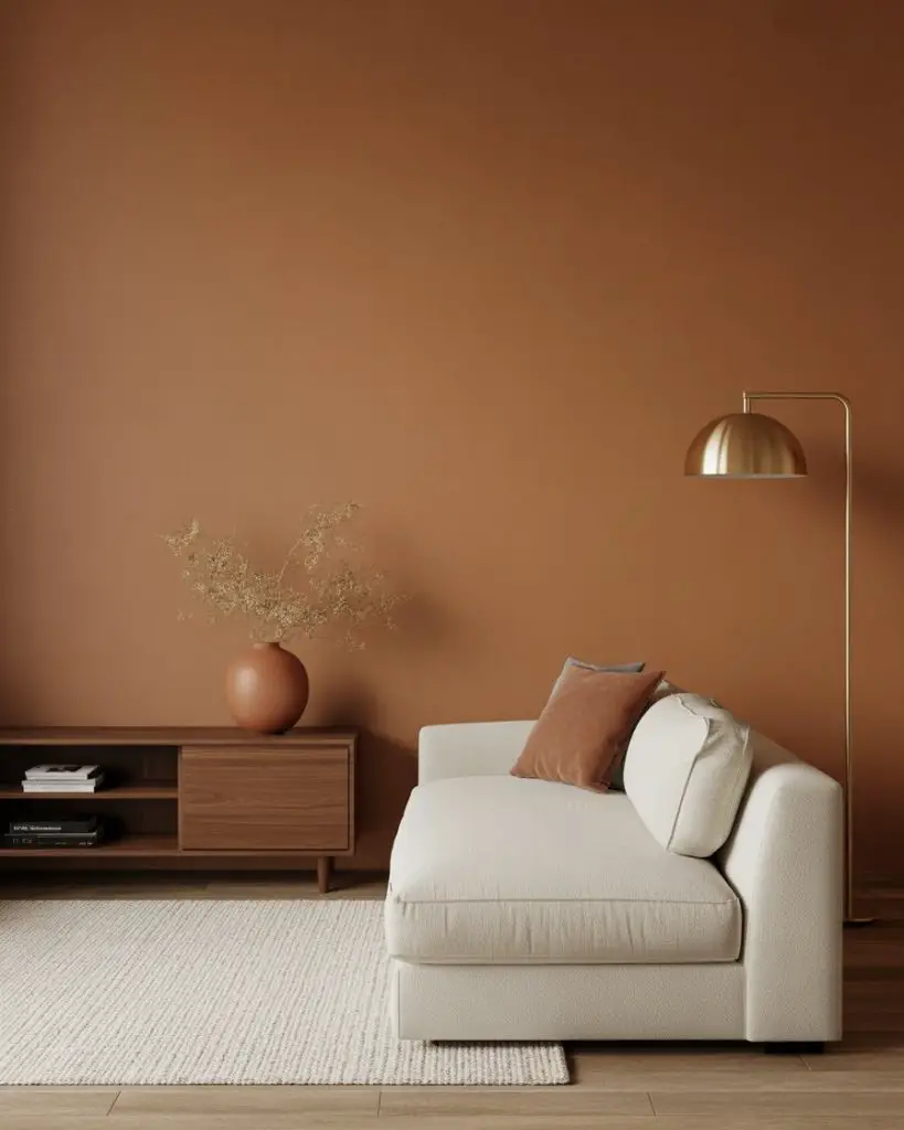 This works best in homes with open floor plans where the living room flows into the kitchen or dining area. The warmth of terracotta visually connects spaces without needing a hard color break. If you’re worried it might feel too bold, start with terracotta in smaller doses—throw pillows, artwork, or a single feature wall behind your TV or sofa.