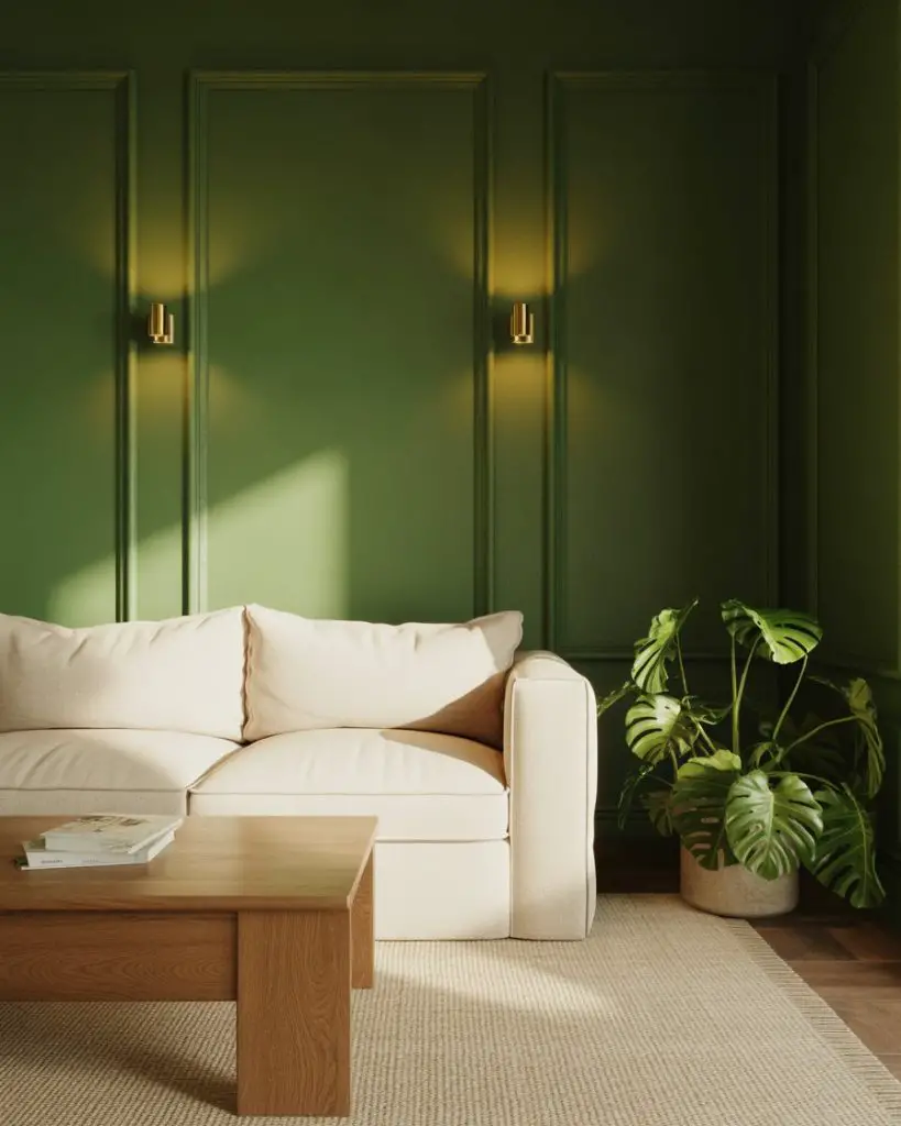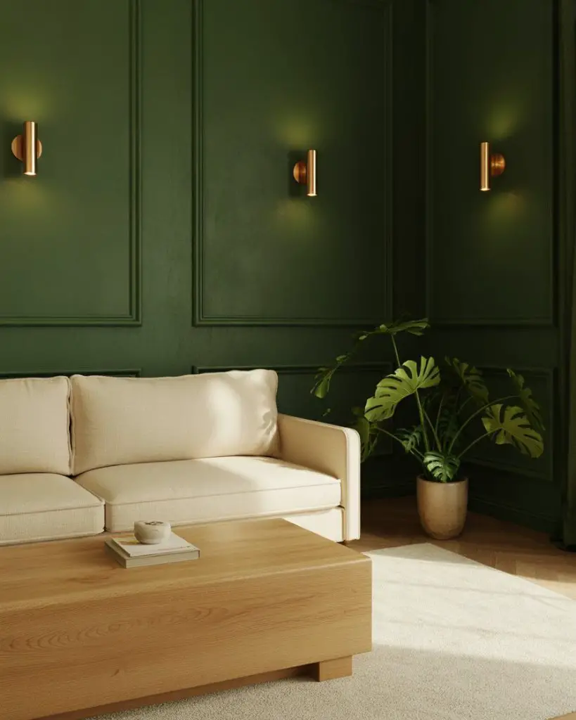 In the Northeast and Midwest, forest green is a go-to for homes with traditional architecture—think Colonial, Craftsman, or Tudor styles. The color echoes the wooded surroundings and feels grounded and timeless. One practical tip: if you’re painting all four walls green, make sure your lighting is warm-toned (2700K bulbs) to prevent the space from feeling cold or cave-like.