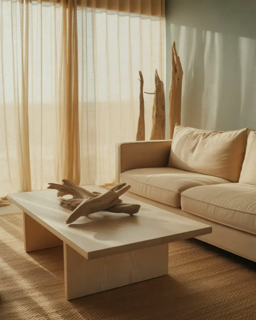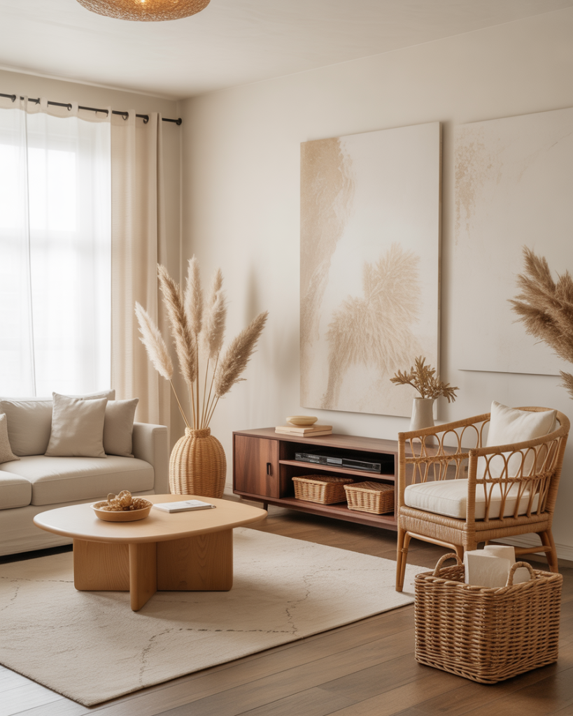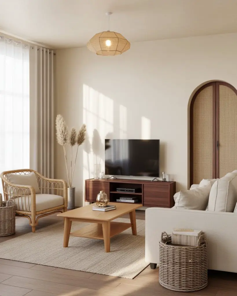 All-white living rooms are far from boring when you layer in multiple wood tones and textures. This approach—popularized by Scandinavian and California coastal designs—keeps the palette simple but adds depth through oak, walnut, rattan, and reclaimed wood pieces. It’s a cozy take on minimalism that feels warm and lived-in rather than stark or sterile.
